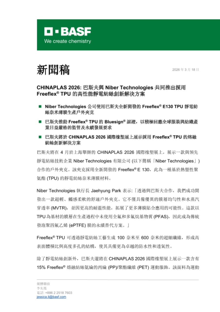 - Niber Technologies 公司使用巴斯夫全新開發的 Freeflex® E130 TPU 靜電紡絲奈米薄膜生產戶外夾克