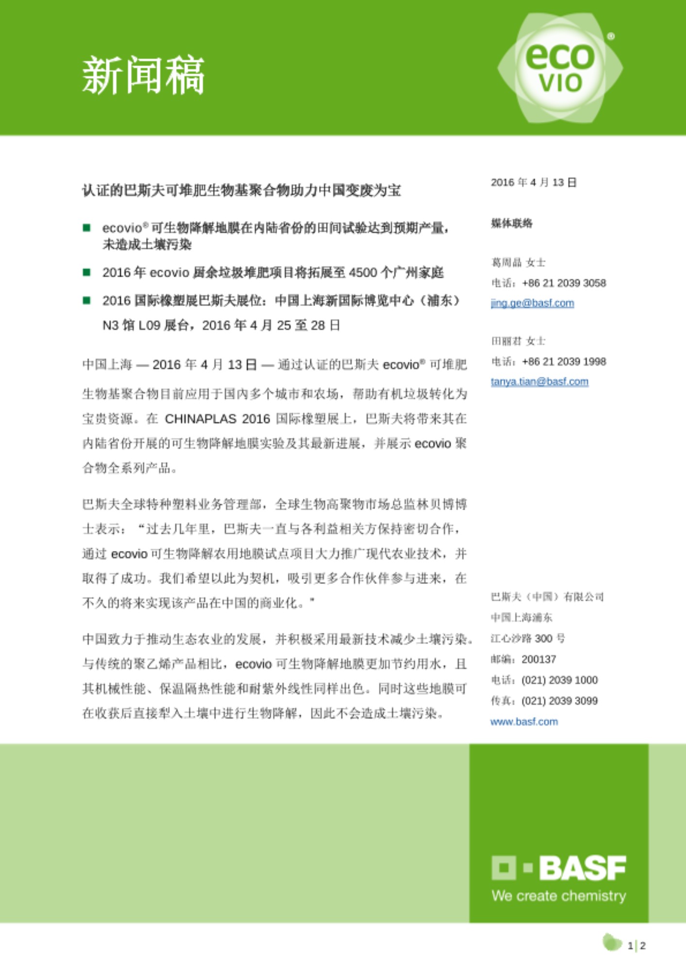 中國上海/台灣台北 — 2016 年 4 月 13日 — 經認證的巴斯夫生質可堆肥ecovio®目前應用於中國多個城市和農場,協助將有機垃圾轉化為寶貴資源。在CHINAPLAS 2016 國際橡塑展上,巴斯夫將展示在中國進行的可生物分解地膜實驗及其最新進展,並展出 ecovio 聚合物全系列產品。