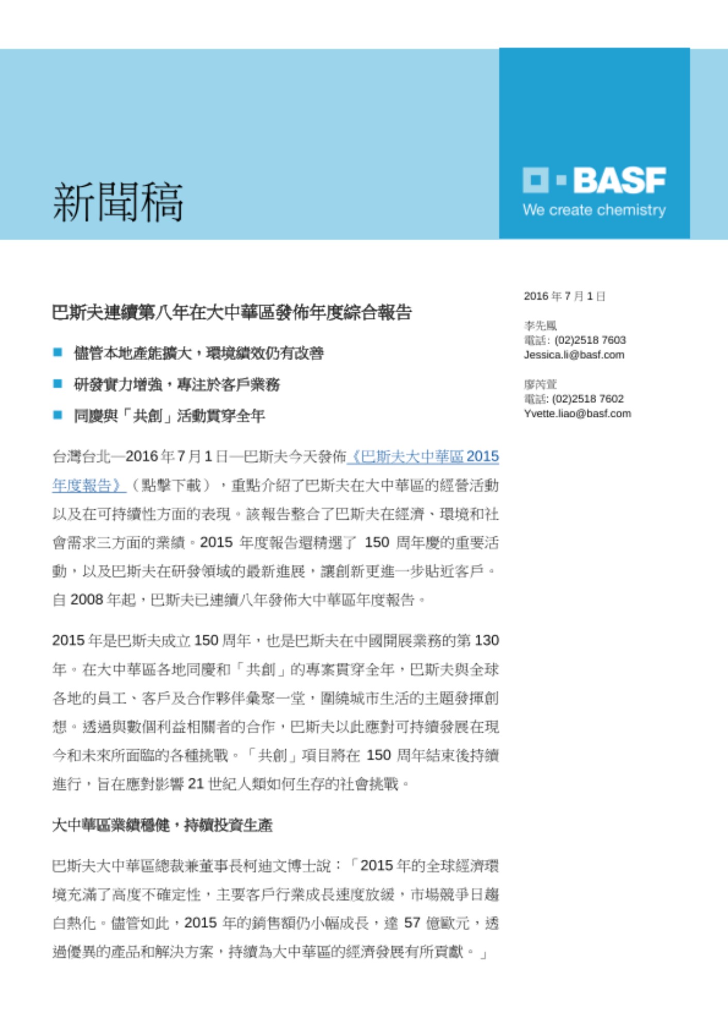 台灣台北─2016年7月1日─巴斯夫今天發佈《巴斯夫大中華區2015年度報告》(點擊下載),重點介紹了巴斯夫在大中華區的經營活動以及在可持續性方面的表現。該報告整合了巴斯夫在經濟、環境和社會需求三方面的業績。2015年度報告還精選了150周年慶的重要活動,以及巴斯夫在研發領域的最新進展,讓創新更進一步貼近客戶。自2008年起,巴斯夫已連續八年發佈大中華區年度報告。