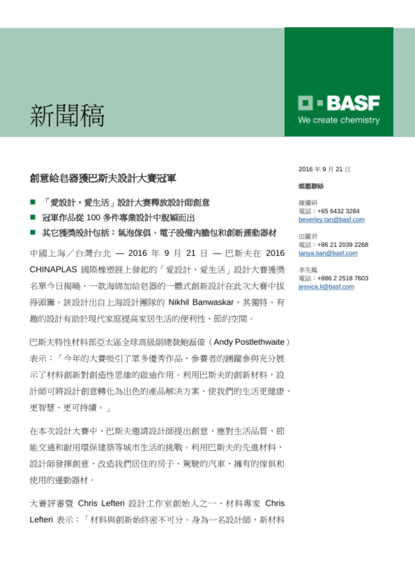 中國上海/台灣台北 — 2016 年 9 月 21 日 — 巴斯夫在 2016 CHINAPLAS國際橡塑展上發起的「愛設計,愛生活」設計大賽獲獎名單今日揭曉,一款海綿加給皂器的一體式創新設計在此次大賽中拔得頭籌。該設計出自上海設計團隊的 Nikhil Banwaskar,其獨特、有趣的設計有助於現代家庭提高家居生活的便利性、節約空間。