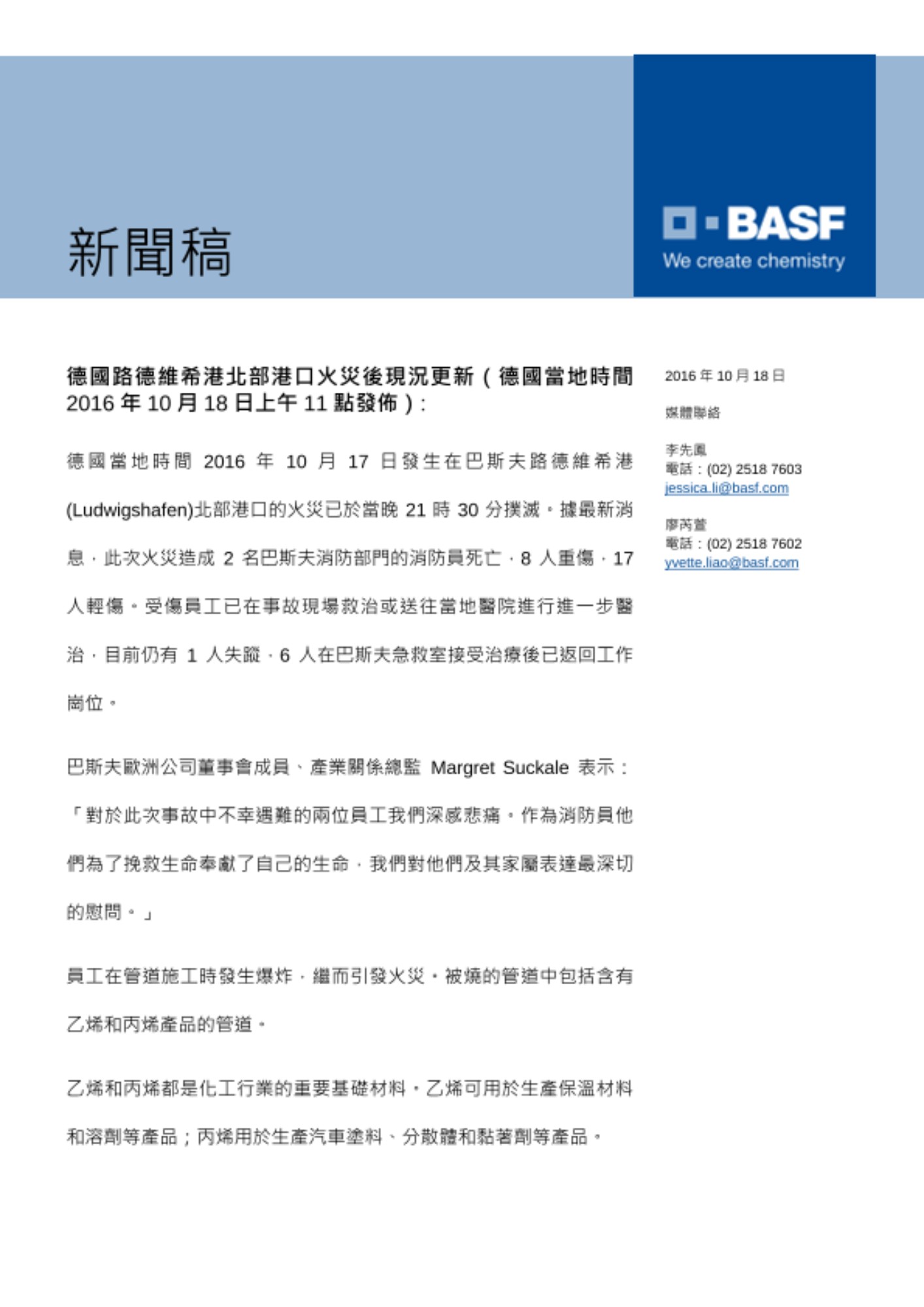 德國當地時間2016年10月17日發生在巴斯夫路德維希港(Ludwigshafen)北部港口的火災已於當晚21時30分撲滅。據最新消息,此次火災造成2名巴斯夫消防部門的消防員死亡,8人重傷,17人輕傷。受傷員工已在事故現場救治或送往當地醫院進行進一步醫治,目前仍有1人失蹤,6人在巴斯夫急救室接受治療後已返回工作崗位。