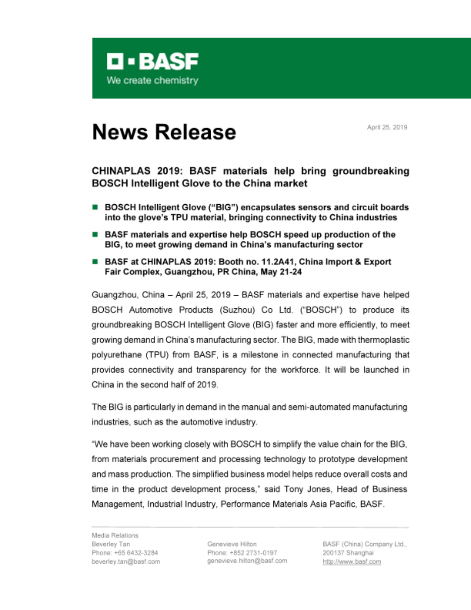 Guangzhou, China – April 25, 2019 – BASF materials and expertise have helped BOSCH Automotive Products (Suzhou) Co Ltd. (“BOSCH”) to produce its groundbreaking BOSCH Intelligent Glove (BIG) faster and more efficiently, to meet growing demand in China’s manufacturing sector. The BIG, made with thermoplastic polyurethane (TPU) from BASF, is a milestone in connected manufacturing that provides connectivity and transparency for the workforce. It will be launched in China in the second half of 2019.