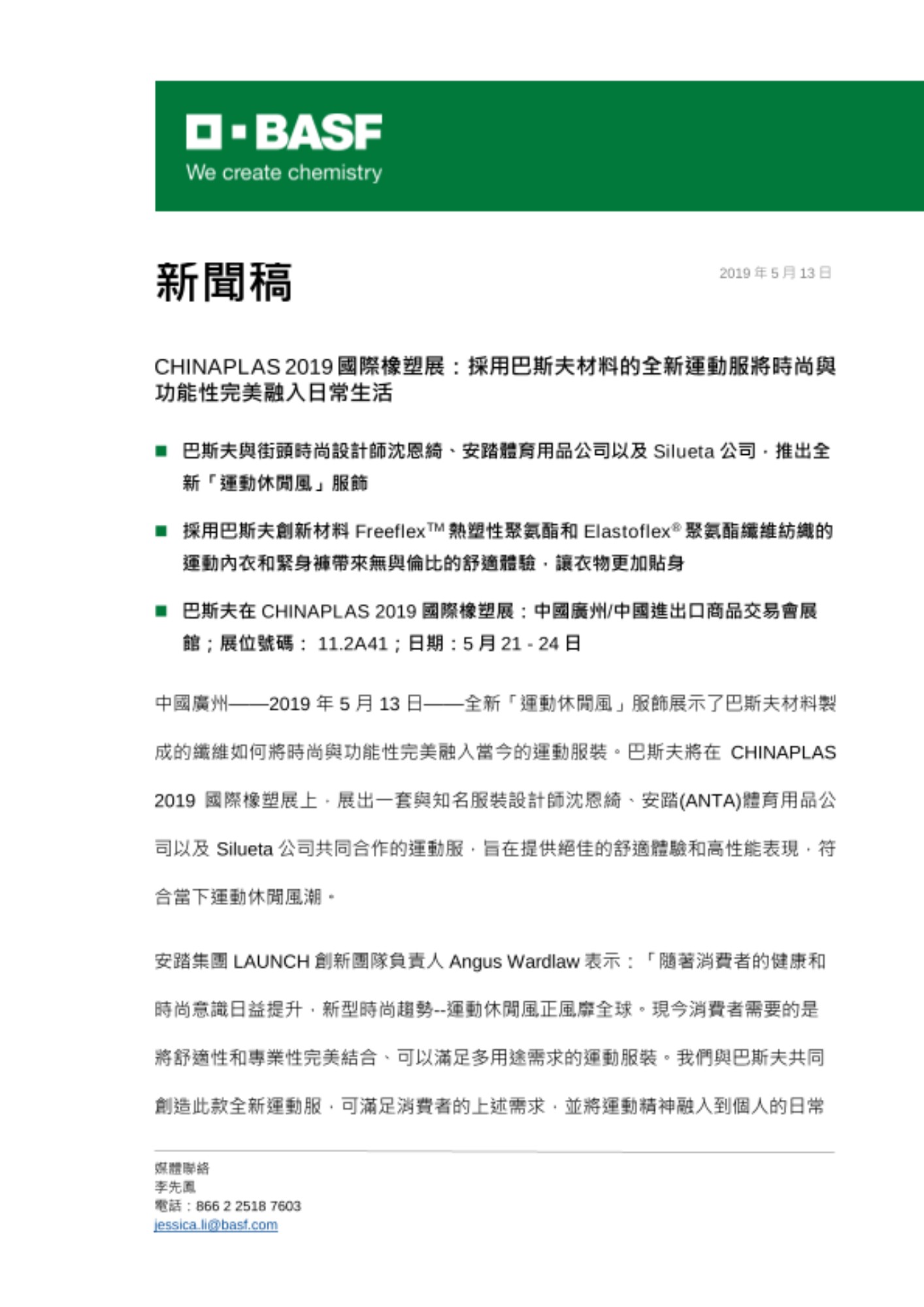 中國廣州—2019年5月10日—全新「運動休閒風」服飾展示了巴斯夫材料製成的纖維如何將時尚與功能性完美融入當今的運動服裝。巴斯夫將在CHINAPLAS 2019國際橡塑展上,展出一套與知名服裝設計師沈恩綺、安踏(ANTA)體育用品公司以及 Silueta公司共同合作的運動服,旨在提供絕佳的舒適體驗和高性能表現,符合當下運動休閒風潮。