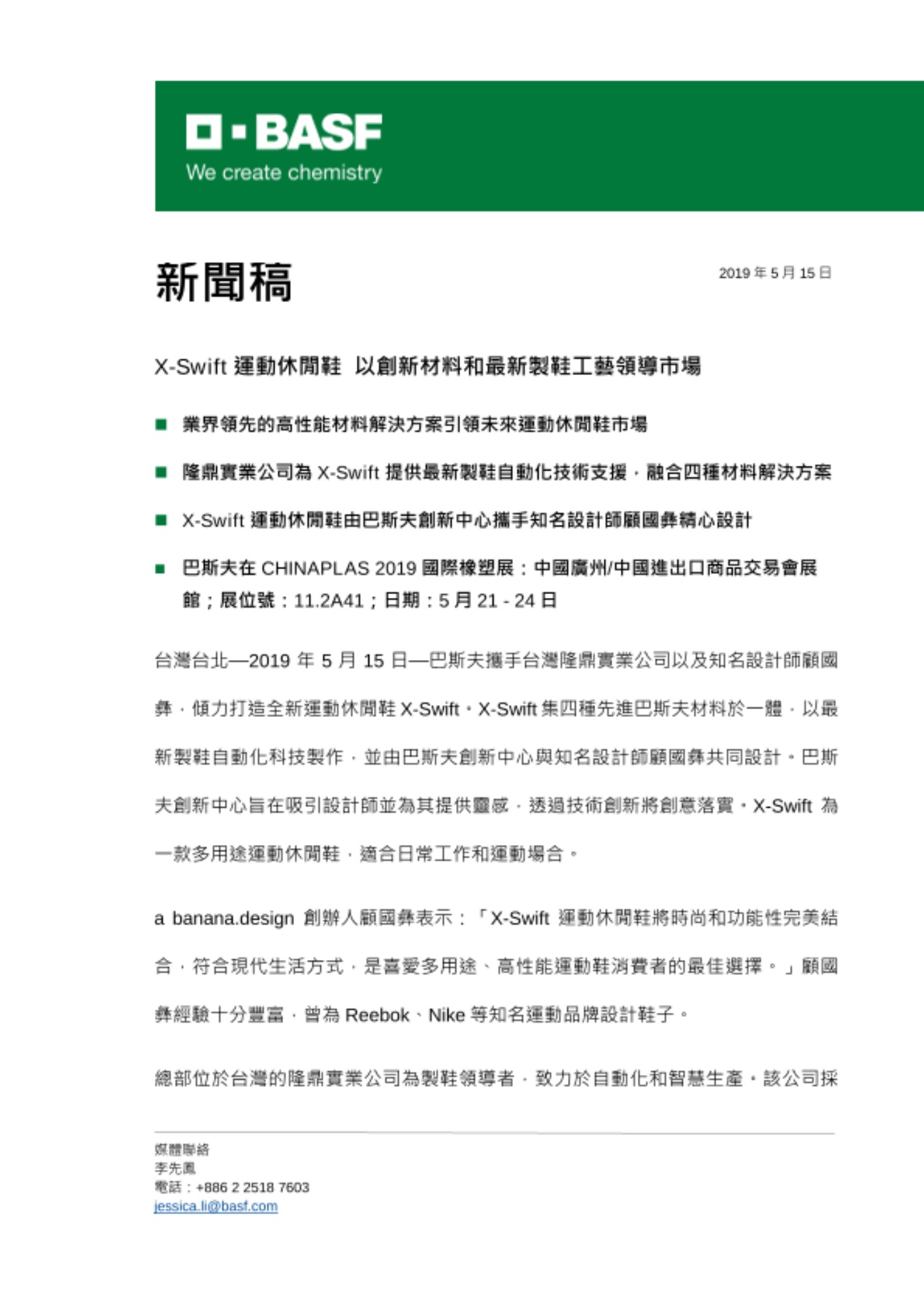 台灣台北—2019年5月15日—巴斯夫攜手台灣隆鼎實業公司以及知名設計師顧國彝,傾力打造全新運動休閒鞋X-Swift。X-Swift集四種先進巴斯夫材料於一體,以最新製鞋自動化科技製作,並由巴斯夫創新中心與知名設計師顧國彝共同設計。巴斯夫創新中心旨在吸引設計師並為其提供靈感,透過技術創新將創意落實。X-Swift為一款多用途運動休閒鞋,適合日常工作和運動場合。