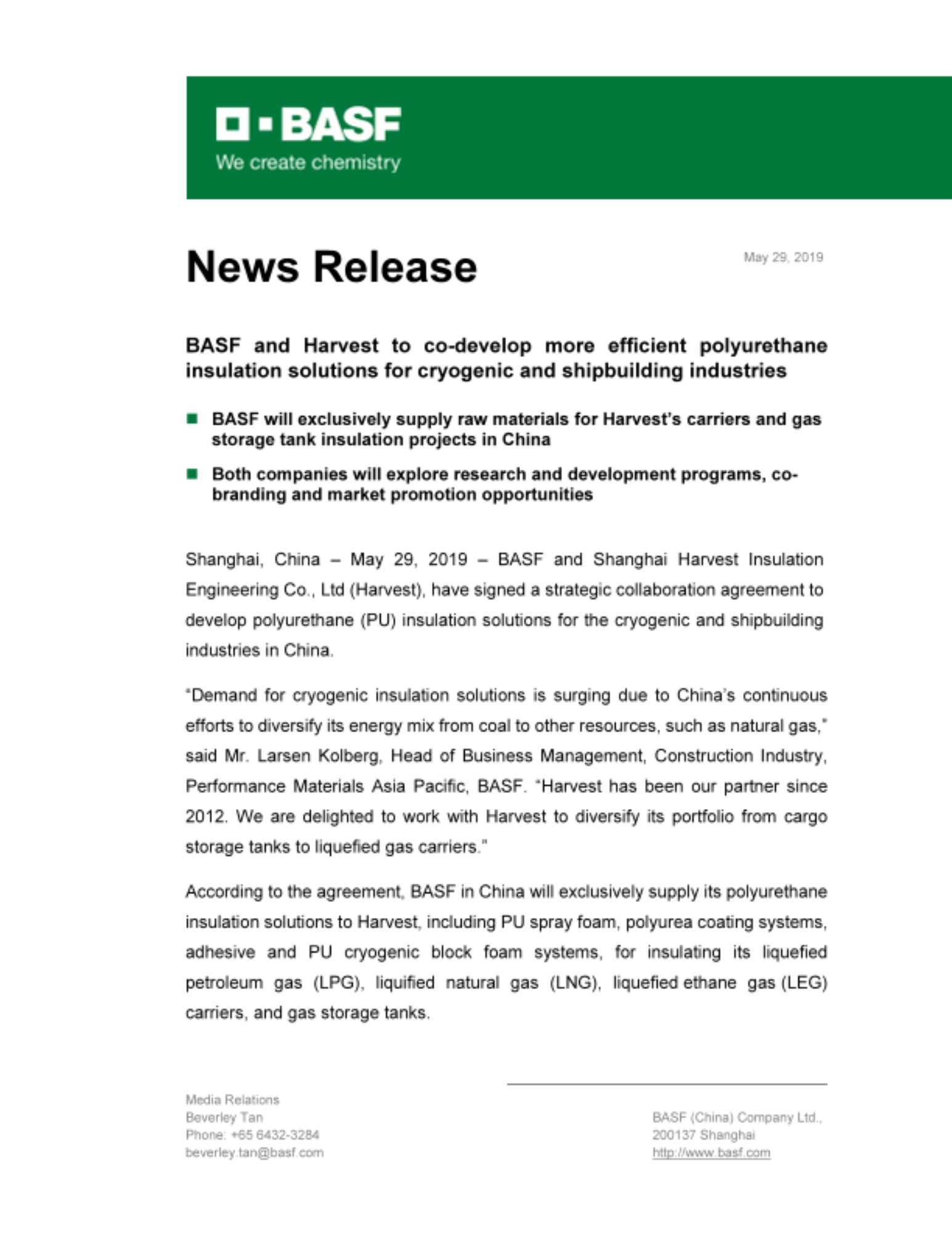 - BASF will exclusively supply raw materials for Harvest’s carriers and gas storage tank insulation projects in China