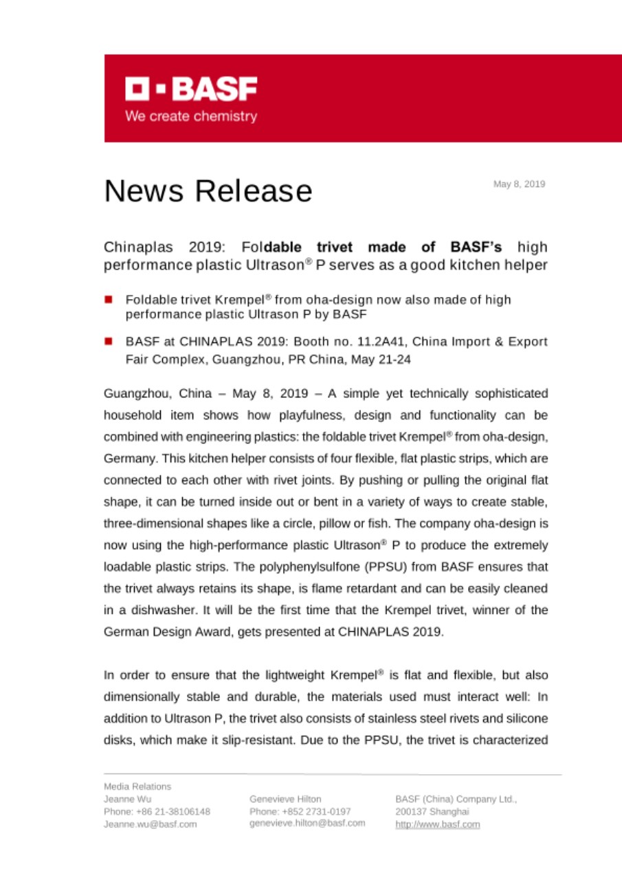 Guangzhou, China – May 8, 2019 – A simple yet technically sophisticated household item shows how playfulness, design and functionality can be combined with engineering plastics: the foldable trivet Krempel® from oha-design, Germany. This kitchen helper consists of four flexible, flat plastic strips, which are connected to each other with rivet joints. By pushing or pulling the original flat shape, it can be turned inside out or bent in a variety of ways to create stable, three-dimensional shapes like a circle, pillow or fish. The company oha-design is now using the high-performance plastic Ultrason® P to produce the extremely loadable plastic strips. The polyphenylsulfone (PPSU) from BASF ensures that the trivet always retains its shape, is flame retardant and can be easily cleaned in a dishwasher. It will be the first time that the Krempel trivet, winner of the German Design Award, gets presented at CHINAPLAS 2019.