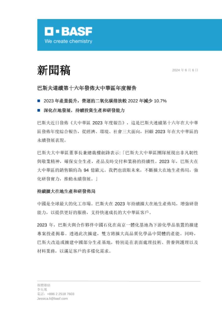 巴斯夫與大中華市場的淵源可以追溯到 1885 年,巴斯夫主要的生產基地位於上海、南京、重慶和湛江,上海創新園是亞太地區的研發樞紐。2023 年,巴斯夫在大中華區的銷售額約為 94 億歐元,截至年底員工人數為 12,115 名。欲瞭解更多資訊,請上網: www.basf.com。