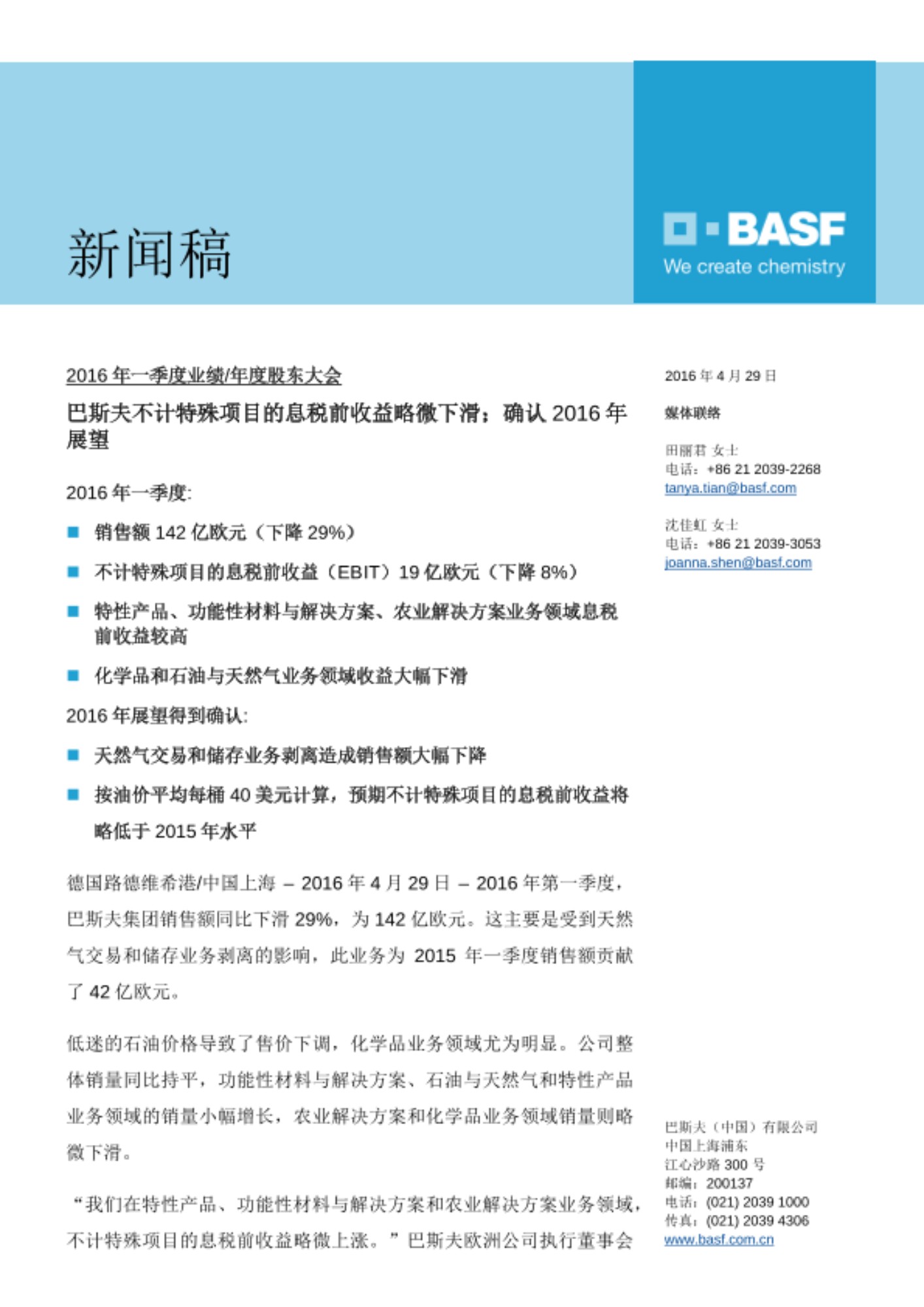 博凱慈表示:「我們2016年的全年展望確認:我們的目標是提高所有業務領域的銷售量,但是巴斯夫集團的銷售額將明顯下降,尤其是因為天然氣貿易和儲存業務的分割以及石油和天然氣價格的下滑。我們預期不計特殊專案的息稅前收益將略低於2015年水準。 在目前動盪、充滿挑戰的環境下,這是一個雄心勃勃的目標,並且在一定程度上受油價走勢所影響。」