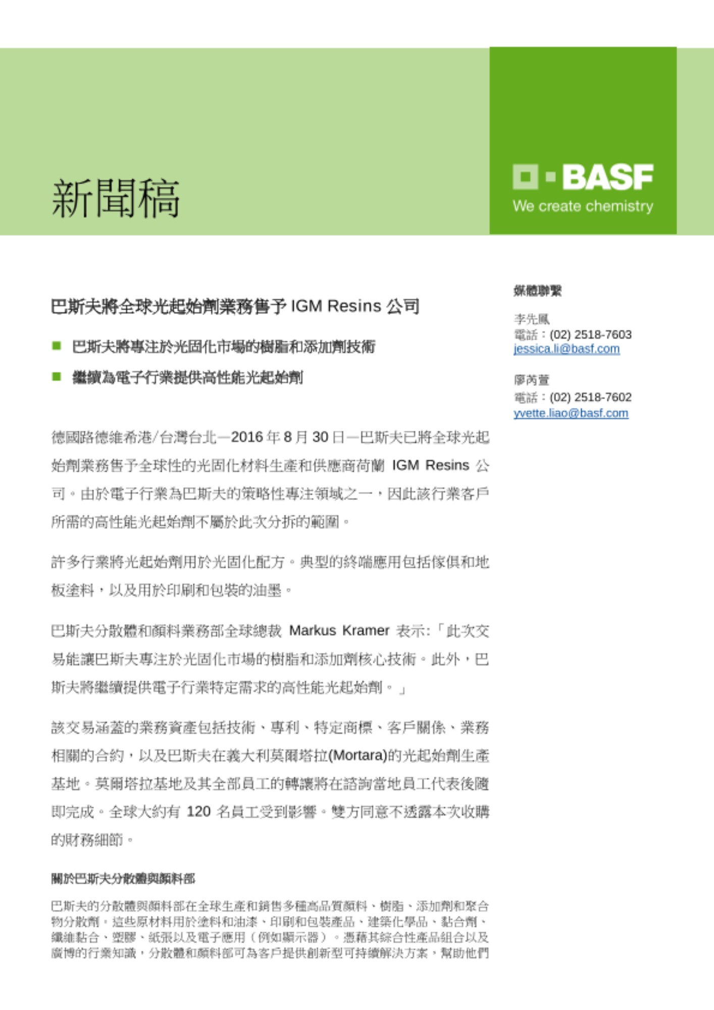 德國路德維希港/台灣台北—2016年8月30日—巴斯夫已將全球光起始劑業務售予全球性的光固化材料生產和供應商荷蘭IGM Resins 公司。由於電子行業為巴斯夫的策略性專注領域之一,因此該行業客戶所需的高性能光起始劑不屬於此次分拆的範圍。