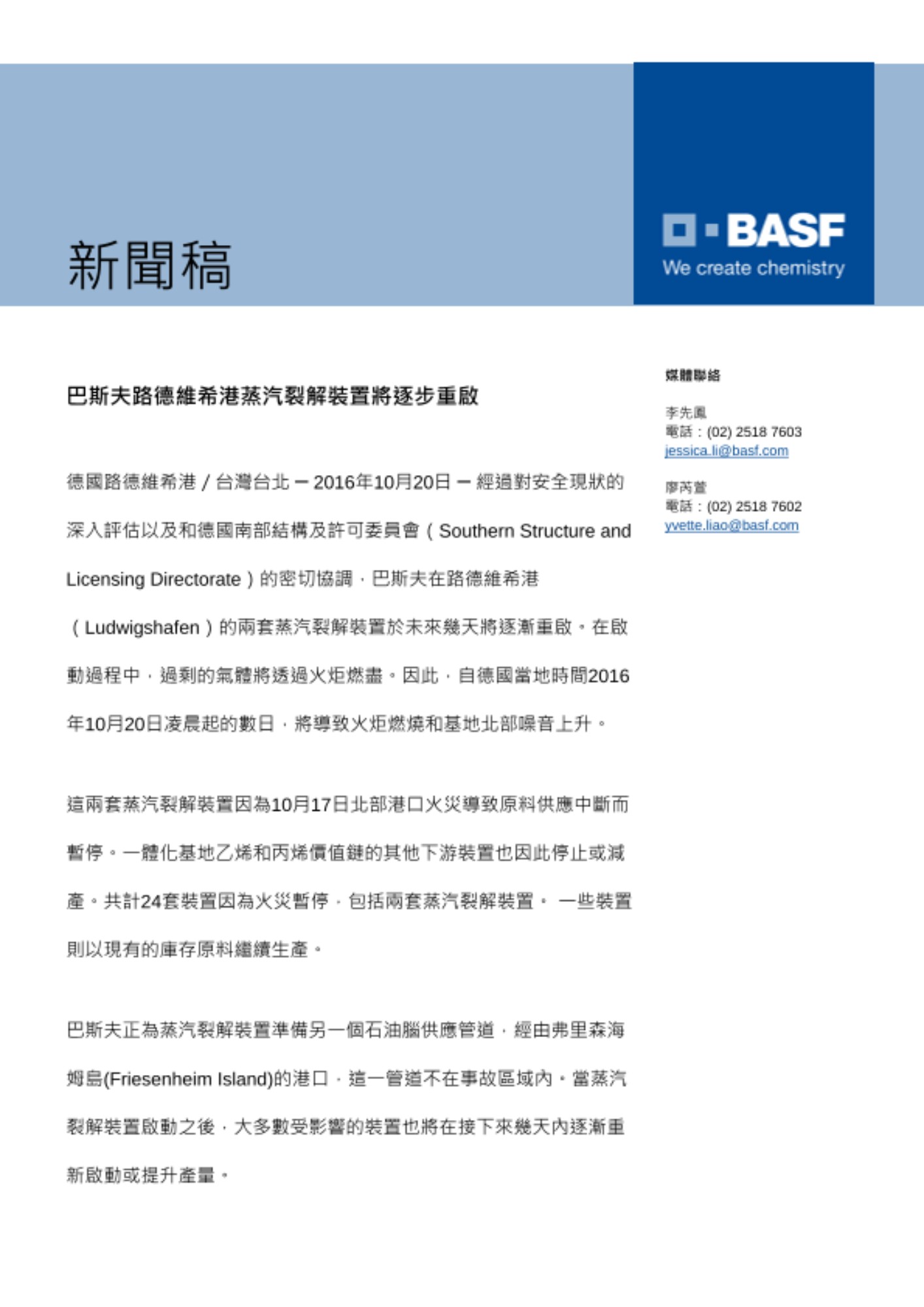 德國路德維希港/台灣台北 ─ 2016年10月20日 ─ 經過對安全現狀的深入評估以及和德國南部結構及許可委員會(Southern Structure and Licensing Directorate)的密切協調,巴斯夫在路德維希港(Ludwigshafen)的兩套蒸汽裂解裝置於未來幾天將逐漸重啟。在啟動過程中,過剩的氣體將透過火炬燃盡。因此,自德國當地時間2016年10月20日凌晨起的數日,將導致火炬燃燒和基地北部噪音上升。