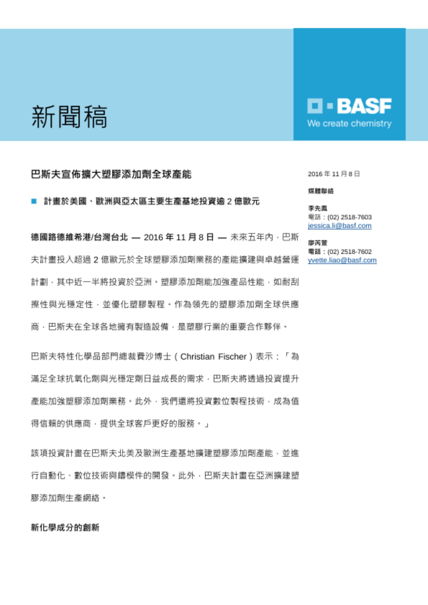 德國路德維希港/台灣台北 — 2016年11月8日 — 未來五年內,巴斯夫計畫投入超過2億歐元於全球塑膠添加劑業務的產能擴建與卓越營運計劃,其中近一半將投資於亞洲。塑膠添加劑能加強產品性能,如耐刮擦性與光穩定性,並優化塑膠製程。作為領先的塑膠添加劑全球供應商,巴斯夫在全球各地擁有製造設備,是塑膠行業的重要合作夥伴。