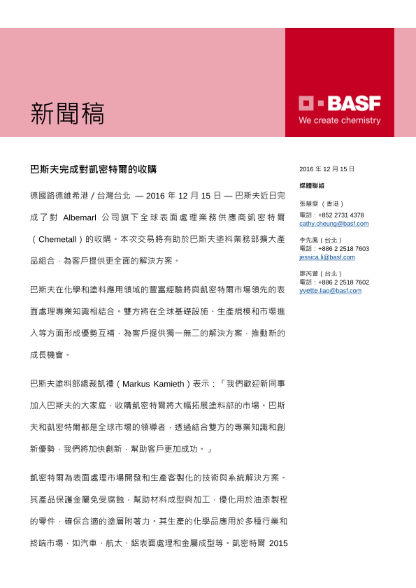 德國路德維希港/台灣台北 — 2016 年 12 月 15 日 — 巴斯夫近日完成了對Albemarl公司旗下全球表面處理業務供應商凱密特爾(Chemetall)的收購。本次交易將有助於巴斯夫塗料業務部擴大產品組合,為客戶提供更全面的解決方案。