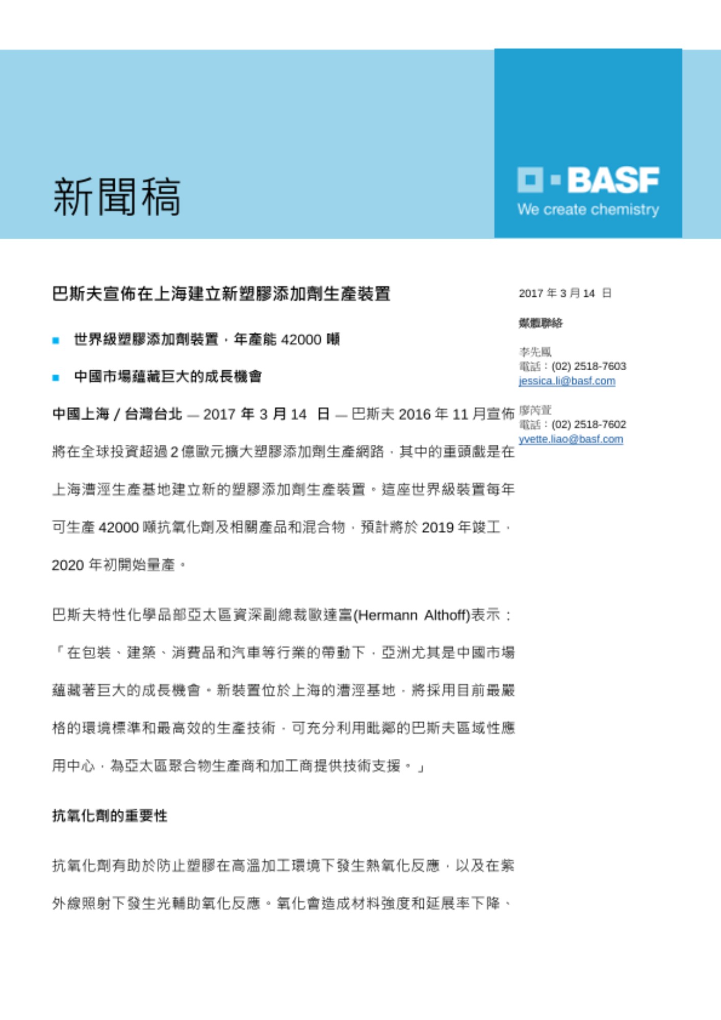 中國上海/台灣台北 — 2017 年 3 月14日 — 巴斯夫2016年11月宣佈將在全球投資超過2億歐元擴大塑膠添加劑生產網路,其中的重頭戲是在上海漕涇生產基地建立新的塑膠添加劑生產裝置。這座世界級裝置每年可生產42000噸抗氧化劑及相關產品和混合物,預計將於2019年竣工,2020 年初開始量產。