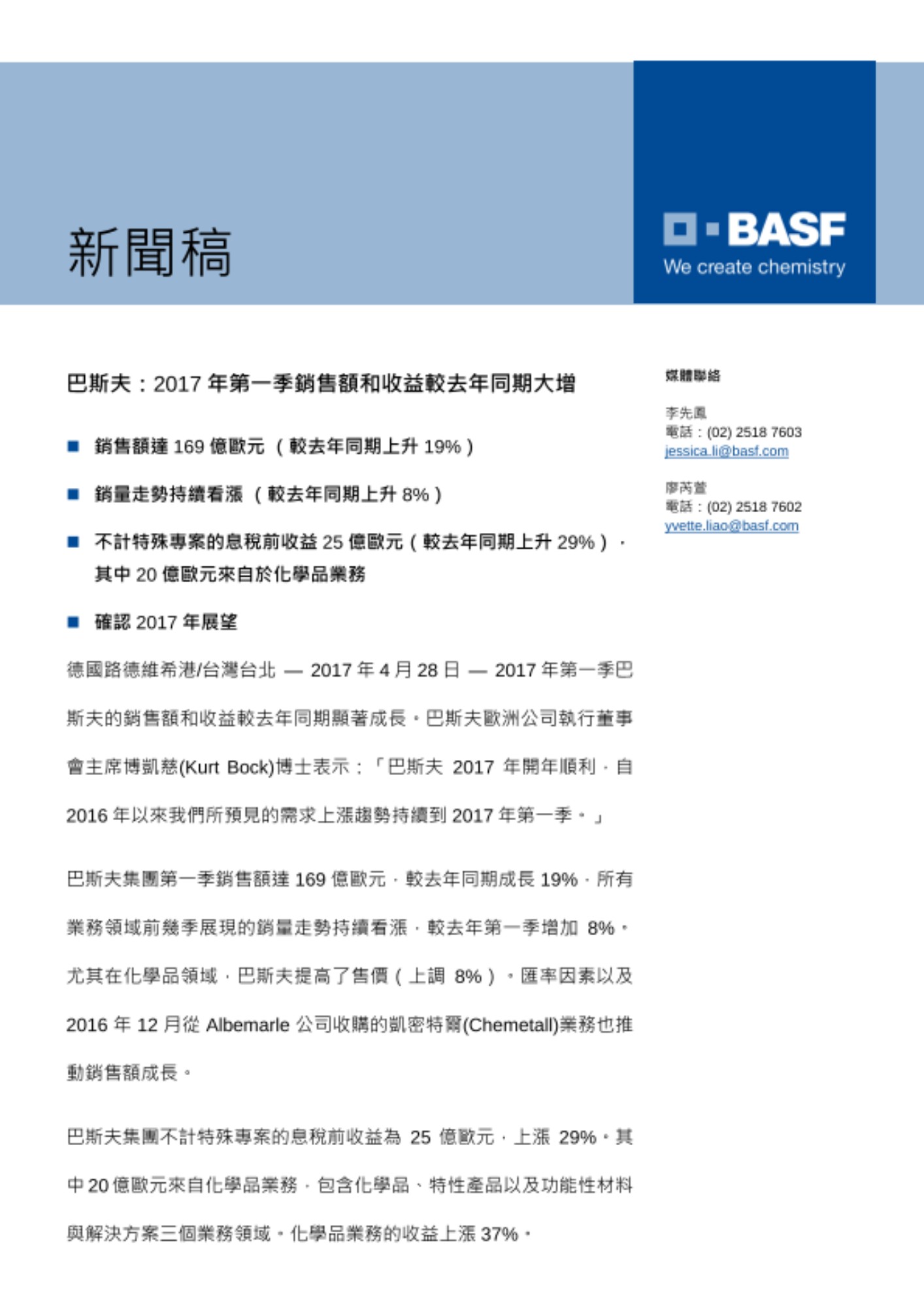 德國路德維希港/台灣台北 — 2017年4月28日 — 2017年第一季巴斯夫的銷售額和收益較去年同期顯著成長。巴斯夫歐洲公司執行董事會主席博凱慈(Kurt Bock)博士表示:「巴斯夫2017年開年順利,自2016年以來我們所預見的需求上漲趨勢持續到2017年第一季。」