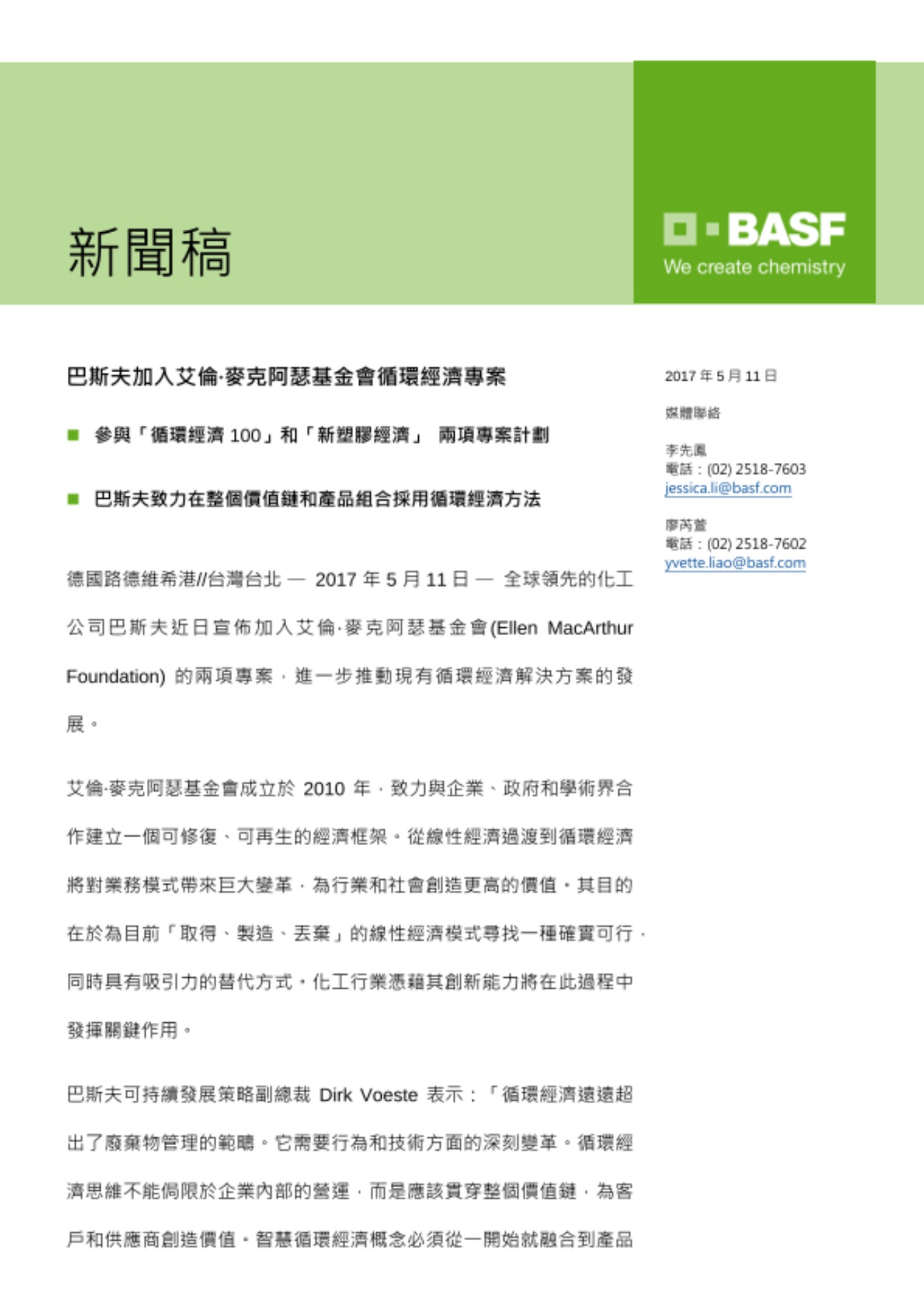 德國路德維希港//台灣台北 — 2017 年 5 月 11日 — 全球領先的化工公司巴斯夫近日宣佈加入艾倫‧麥克阿瑟基金會(Ellen MacArthur Foundation) 的兩項專案,進一步推動現有循環經濟解決方案的發展。