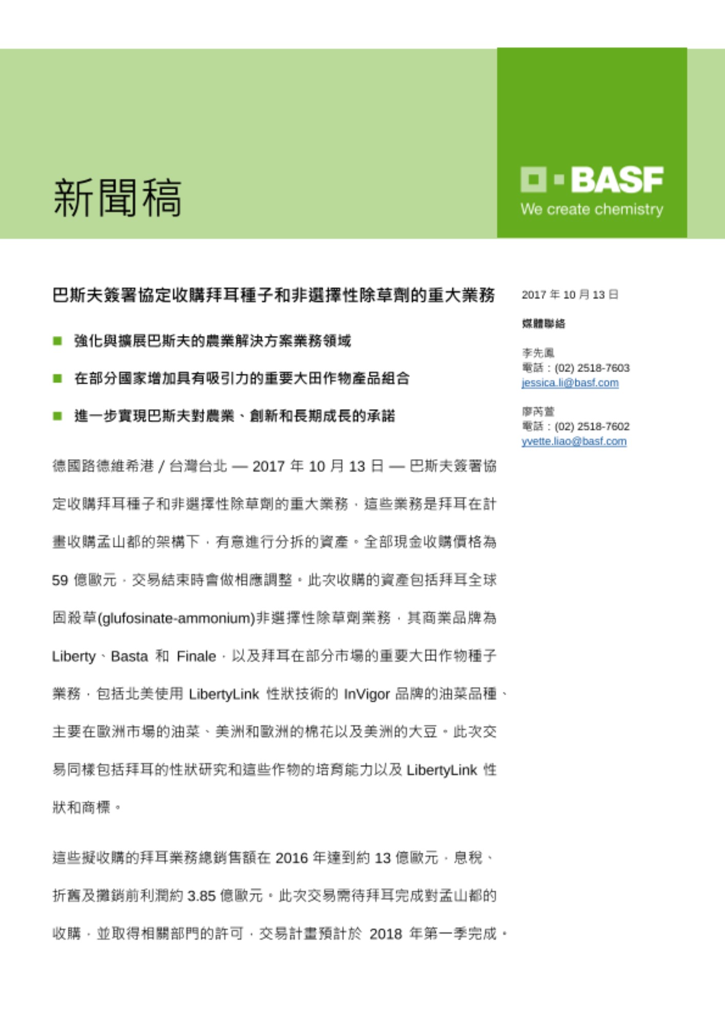 德國路德維希港/台灣台北 — 2017 年 10 月 13 日 — 巴斯夫簽署協定收購拜耳種子和非選擇性除草劑的重大業務,這些業務是拜耳在計畫收購孟山都的架構下,有意進行分拆的資產。全部現金收購價格為59億歐元,交易結束時會做相應調整。此次收購的資產包括拜耳全球固殺草(glufosinate-ammonium)非選擇性除草劑業務,其商業品牌為Liberty®、Basta®和Finale,以及拜耳在部分市場的重要大田作物種子業務,包括北美使用LibertyLink® 性狀技術的InVigor®品牌的油菜品種、主要在歐洲市場的油菜、美洲和歐洲的棉花以及美洲的大豆。此次交易同樣包括拜耳的性狀研究和這些作物的培育能力以及LibertyLink® 性狀和商標。