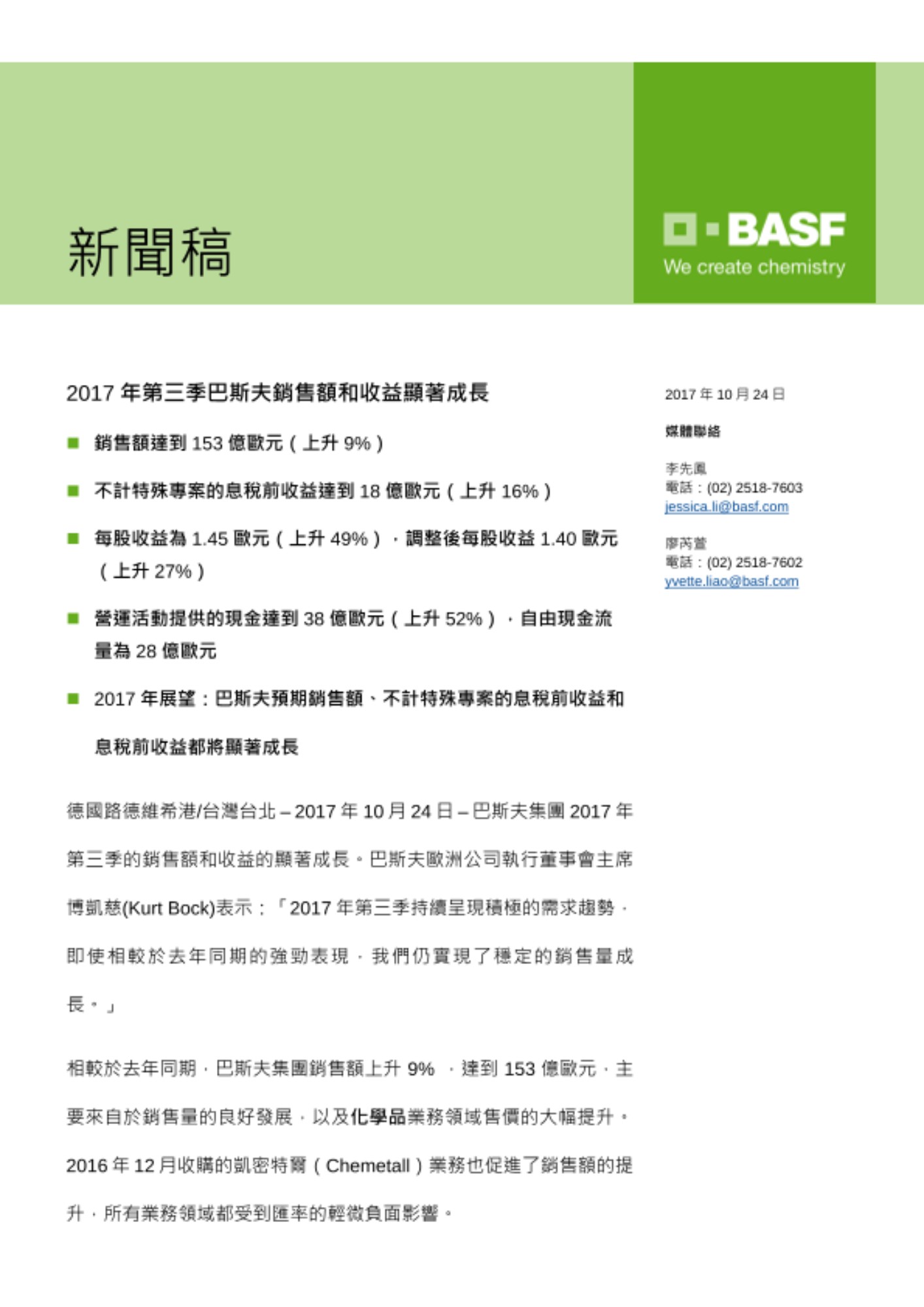德國路德維希港/台灣台北 – 2017年10月24日 – 巴斯夫集團2017年第三季的銷售額和收益的顯著成長。巴斯夫歐洲公司執行董事會主席博凱慈(Kurt Bock)表示:「2017年第三季持續呈現積極的需求趨勢,即使相較於去年同期的強勁表現,我們仍實現了穩定的銷售量成長。」