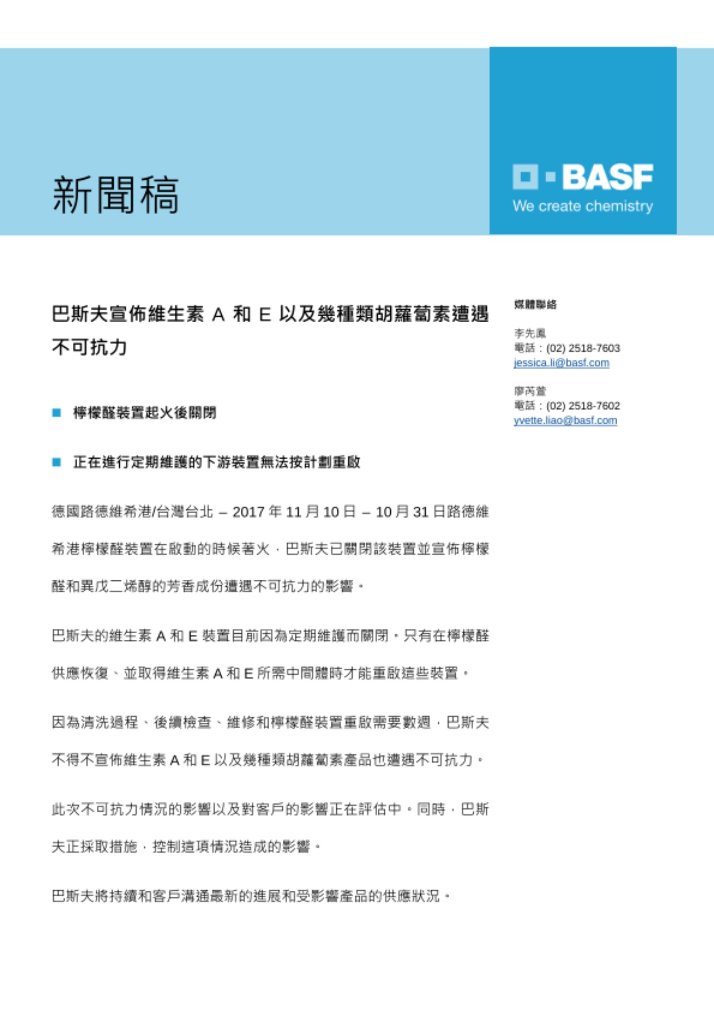 德國路德維希港/台灣台北 – 2017年11月10日 – 10月31日路德維希港檸檬醛裝置在啟動的時候著火,巴斯夫已關閉該裝置並宣佈檸檬醛和異戊二烯醇的芳香成份遭遇不可抗力的影響。