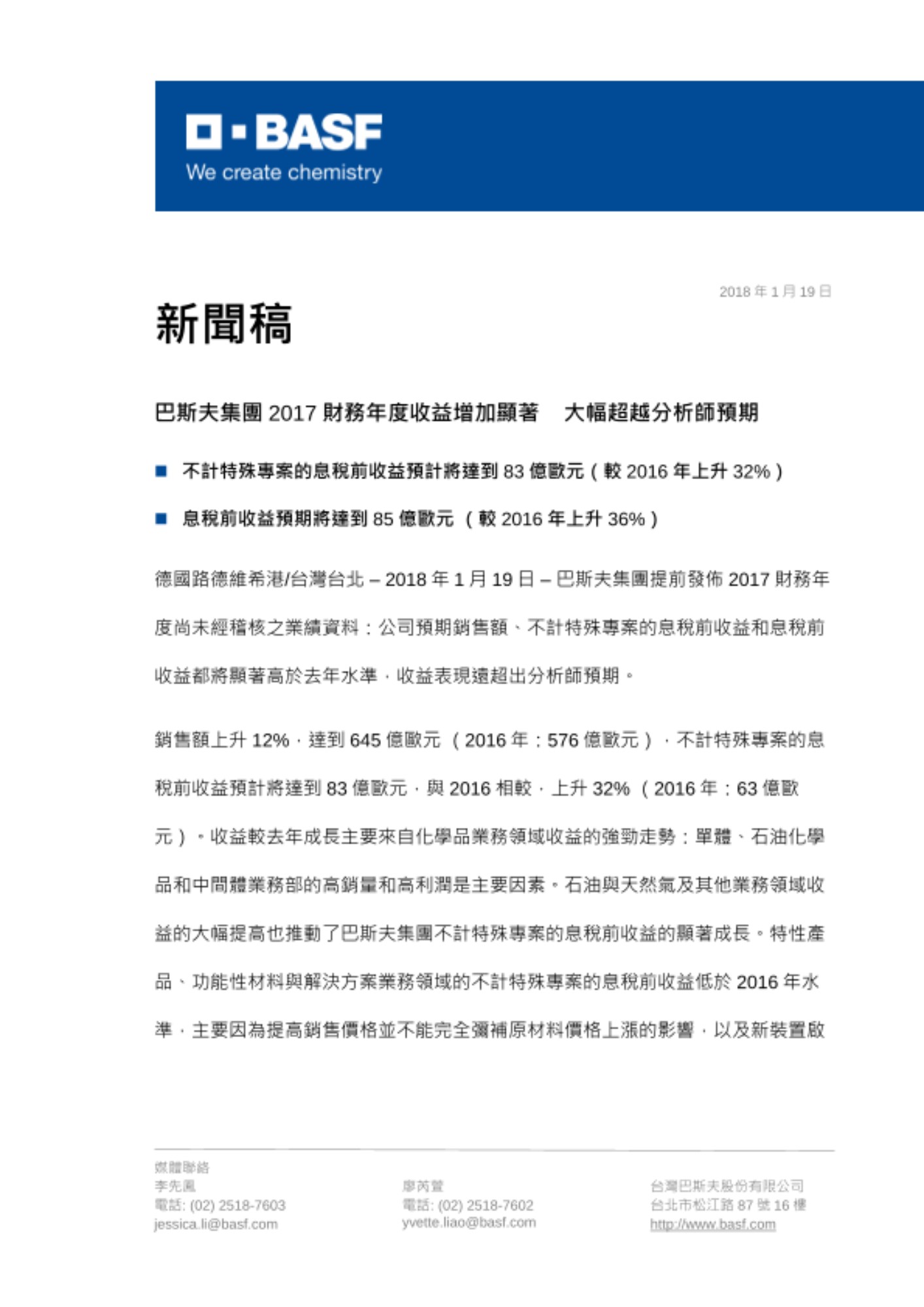 德國路德維希港/台灣台北 – 2018年1月19日 – 巴斯夫集團提前發佈2017財務年度尚未經稽核之業績資料:公司預期銷售額、不計特殊專案的息稅前收益和息稅前收益都將顯著高於去年水準,收益表現遠超出分析師預期。