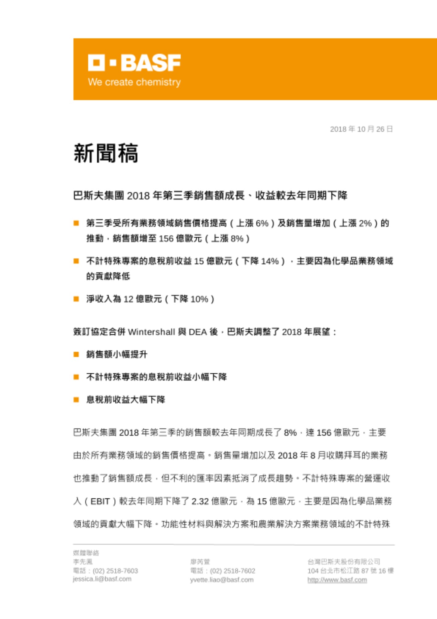 巴斯夫歐洲公司執行董事會主席薄睦樂博士(Dr. Martin Brudermueller)和財務長Hans-Ulrich Engel博士在發佈巴斯夫集團業績時指出影響第三季業績的一些特殊因素:「我們完成了對拜耳重要業務和資產的收購,並達成協議合併Wintershall 及DEA。」在巴斯夫和LetterOne簽訂交易協定後,財務報告將調整追溯到2018年1月1日,前一年的數字也將據此更新。