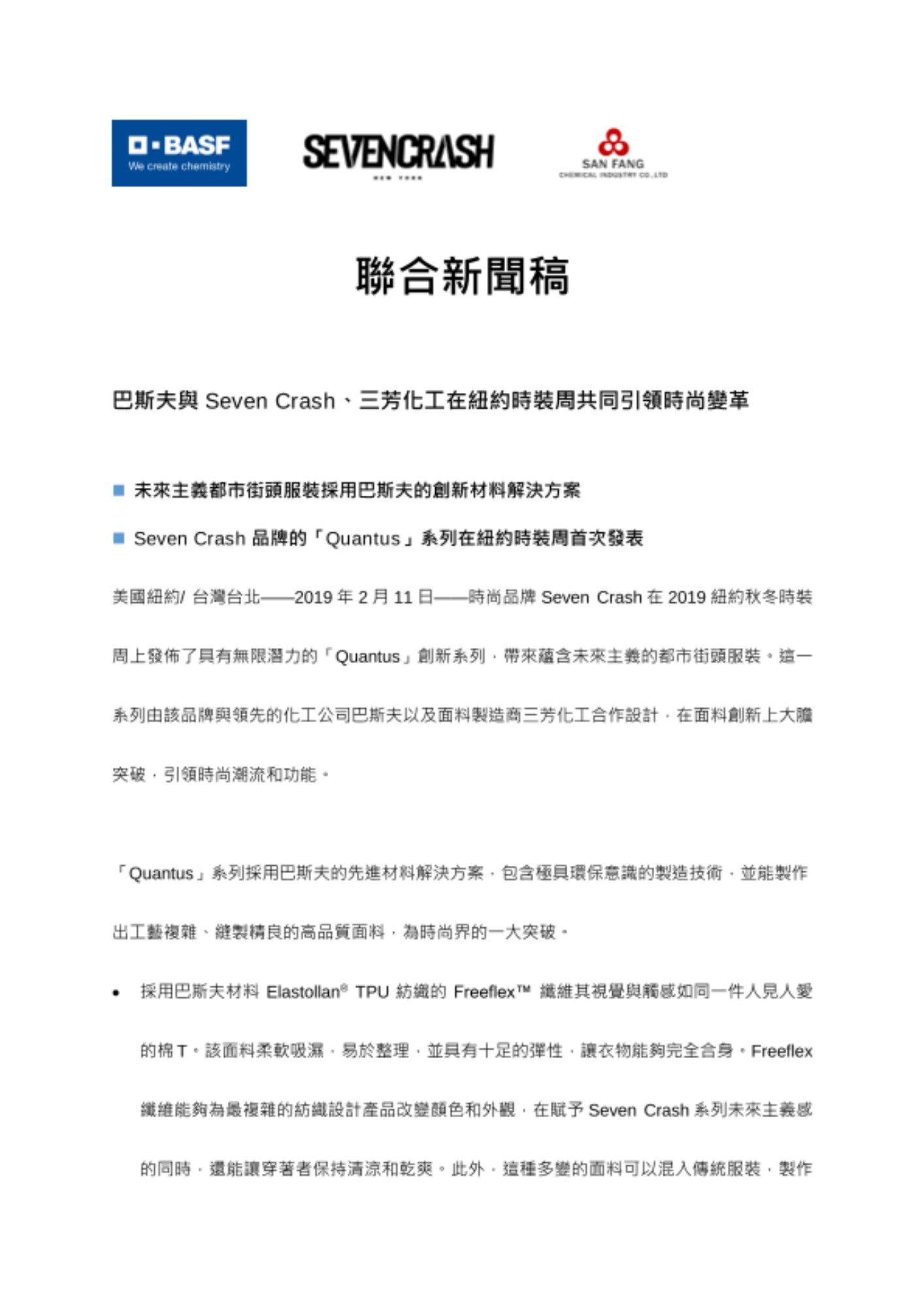 美國紐約/ 台灣台北——2019年2月11日——時尚品牌Seven Crash在2019紐約秋冬時裝周上發佈了具有無限潛力的「Quantus」創新系列,帶來蘊含未來主義的都市街頭服裝。這一系列由該品牌與領先的化工公司巴斯夫以及面料製造商三芳化工合作設計,在面料創新上大膽突破,引領時尚潮流和功能。