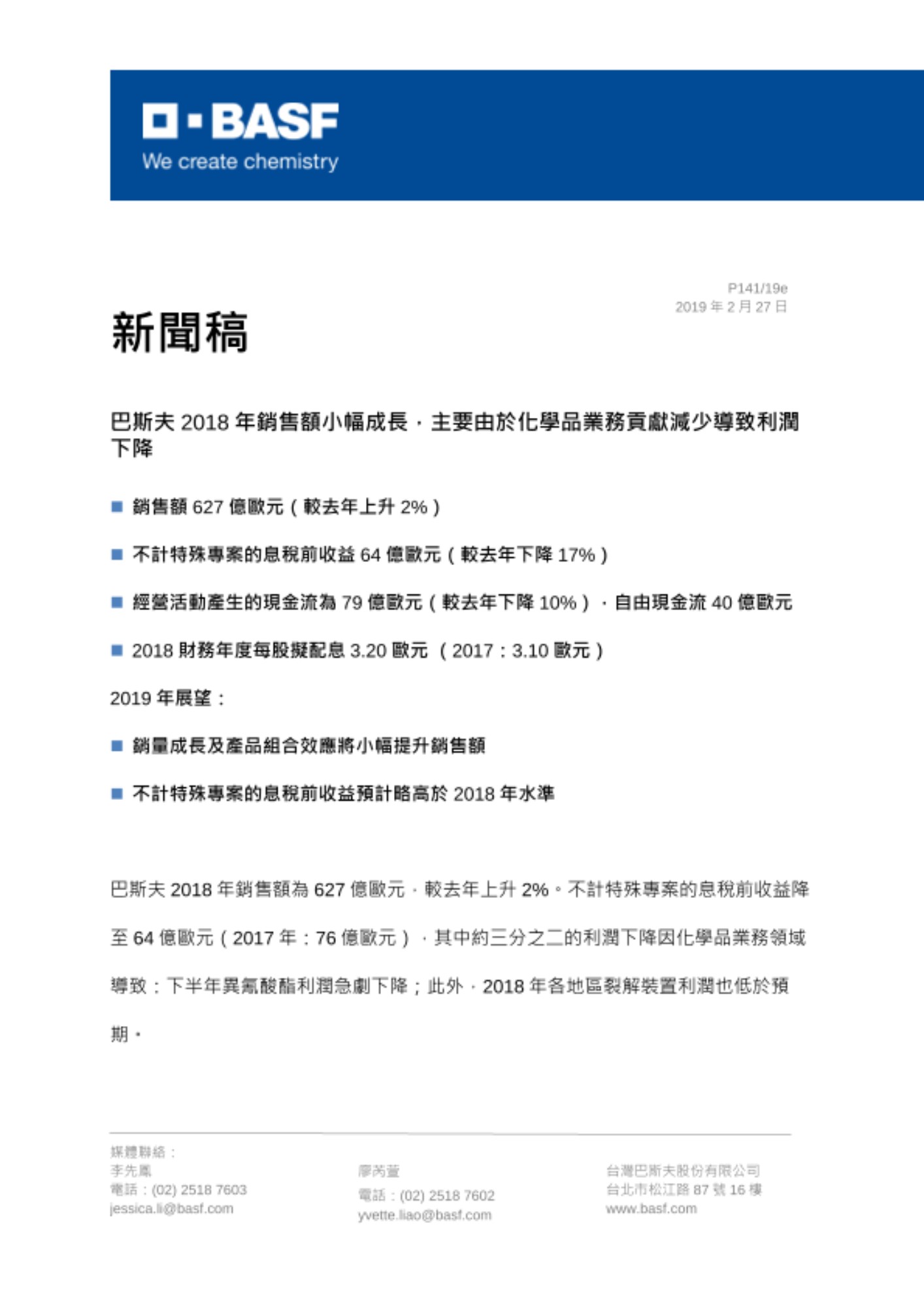 | 巴斯夫集團2018年度報告 (台北時間下午2:00起) | |