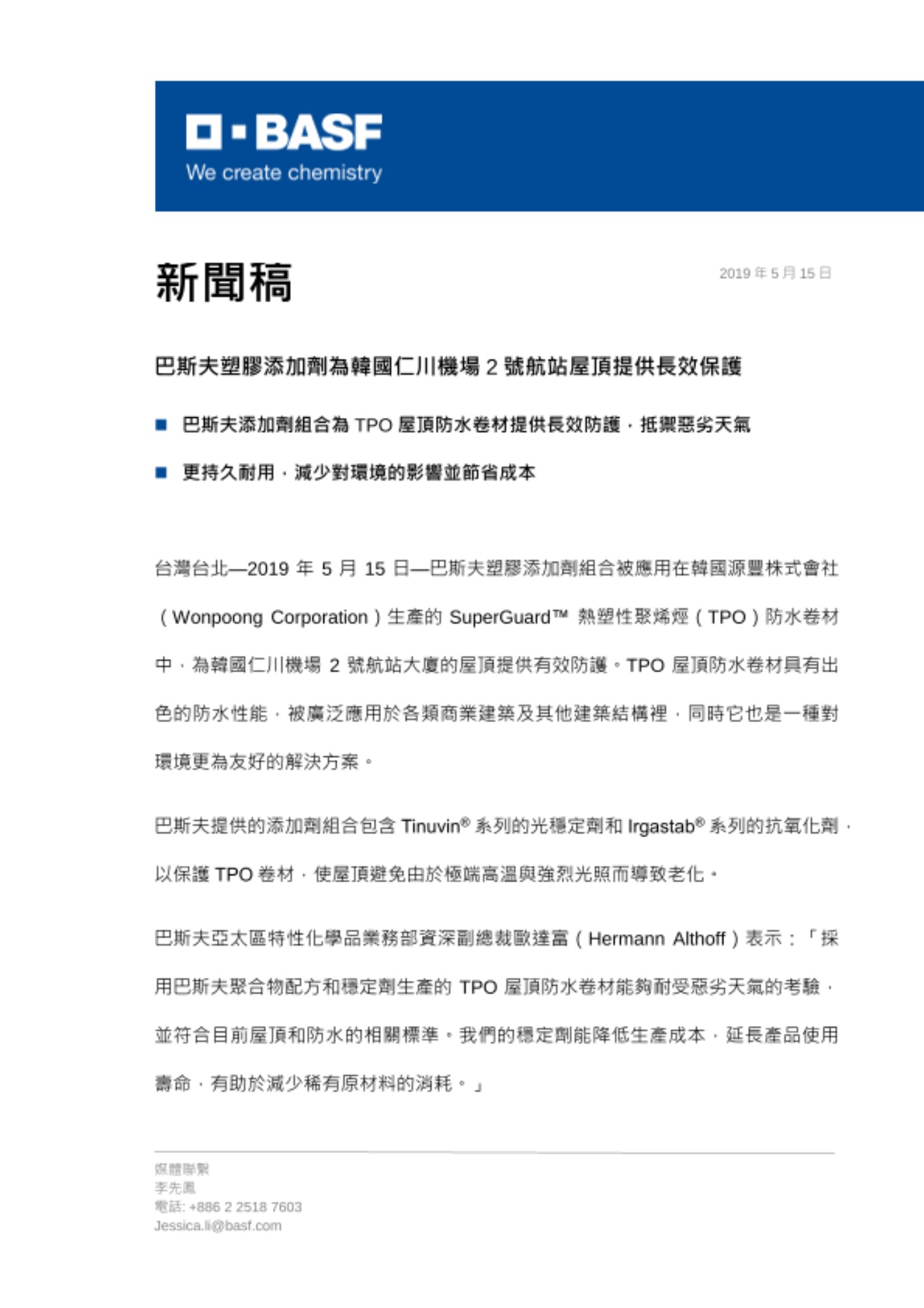 台灣台北—2019年5月15日—巴斯夫塑膠添加劑組合被應用在韓國源豐株式會社(Wonpoong Corporation)生產的SuperGuard™ 熱塑性聚烯烴(TPO)防水卷材中,為韓國仁川機場2號航站大廈的屋頂提供有效防護。TPO屋頂防水卷材具有出色的防水性能,被廣泛應用於各類商業建築及其他建築結構裡,同時它也是一種對環境更為友好的解決方案。