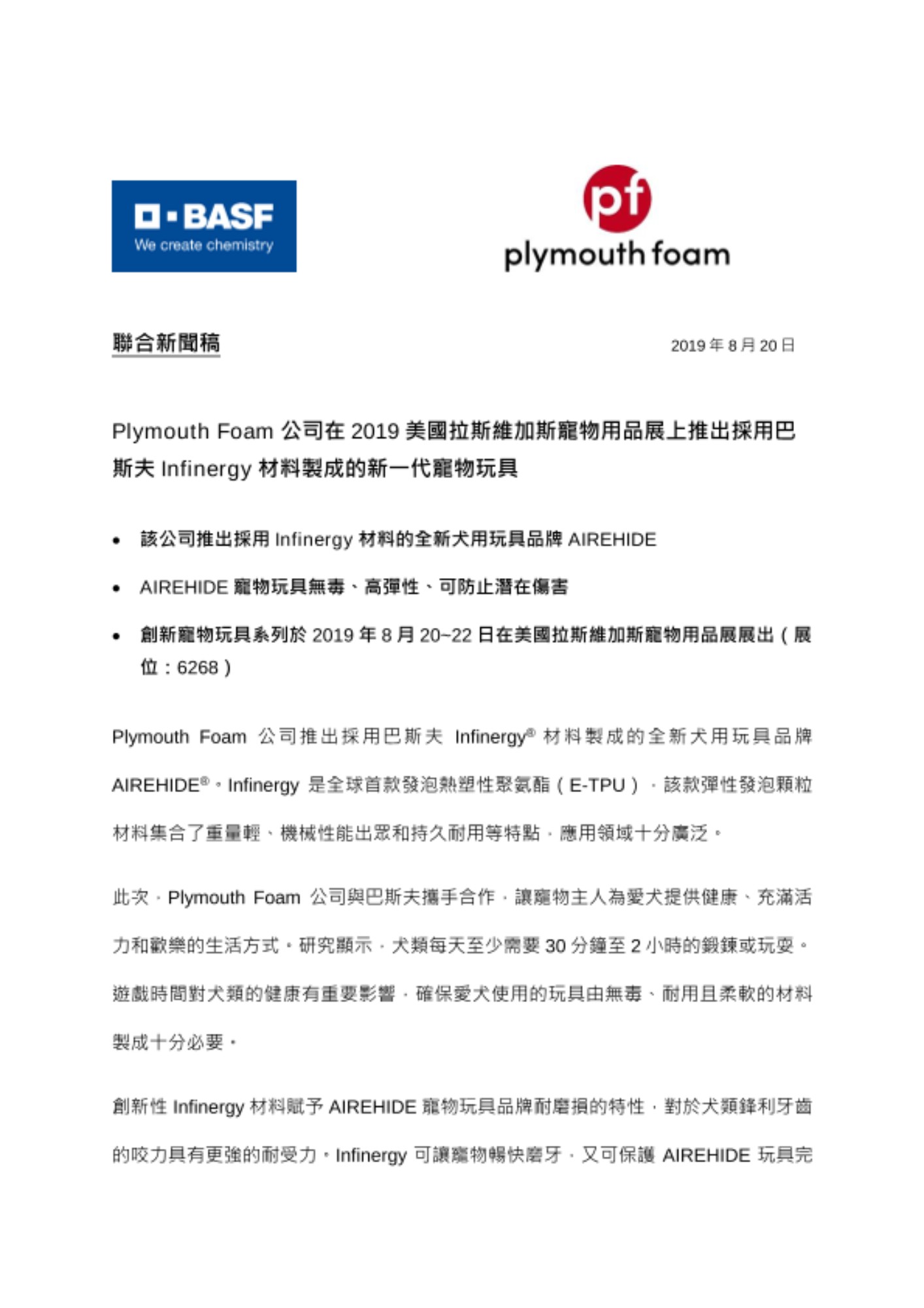 Plymouth Foam公司總裁暨首席執行官David Bolland表示:「雖然我們的團隊是首次參展美國拉斯維加斯寵物用品展,但對於寵物和寵物玩具市場並不陌生。我們是寵物愛好者,花費了近兩年時間對自家愛犬和其他犬隻進行效果測試。Infinergy材料是該應用領域的最佳選擇,幫助我們實現『為寵物主人和愛犬打造歡樂、健康互動玩具』的目標。全新AIREHIDE犬用玩具是我們與巴斯夫首次合作的成果,我們很期待下一次的共同創新。」