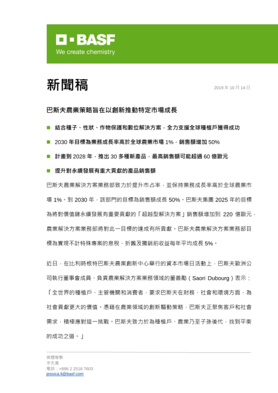 隨著人口激增,全球的未來仰賴人類發展與保持永續農業與健康環境的能力。巴斯夫農業解決方案業務部與種植戶、農業專家、病蟲害管理專家等各方人士合作,為實現這一目標而不斷努力。為此,我們投資研發廣泛的產品組合,包括種子和性狀、化學和生物作物保護、土壤管理、作物健康、蟲害防治和數位化農業。透過實驗室、作物田、辦公室和生產等專家團隊,我們將創新思維和腳踏實地的行動相結合,打造出對種植戶、社會和地球都有價值的具體可行解決方案。2018年,巴斯夫農業解決方案業務部的銷售額達到62億歐元。欲瞭解更多資訊,請上網 www.agriculture.basf.com,或加入巴斯夫農業解決方案業務部的社群媒體。
