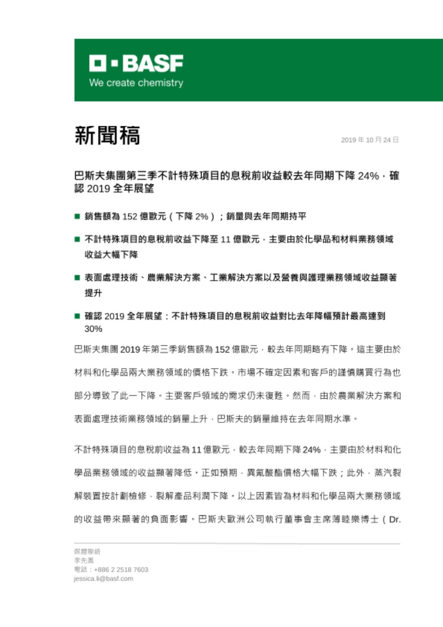 2019年10月24日,您可以從以下巴斯夫官網連結獲取更多資訊: