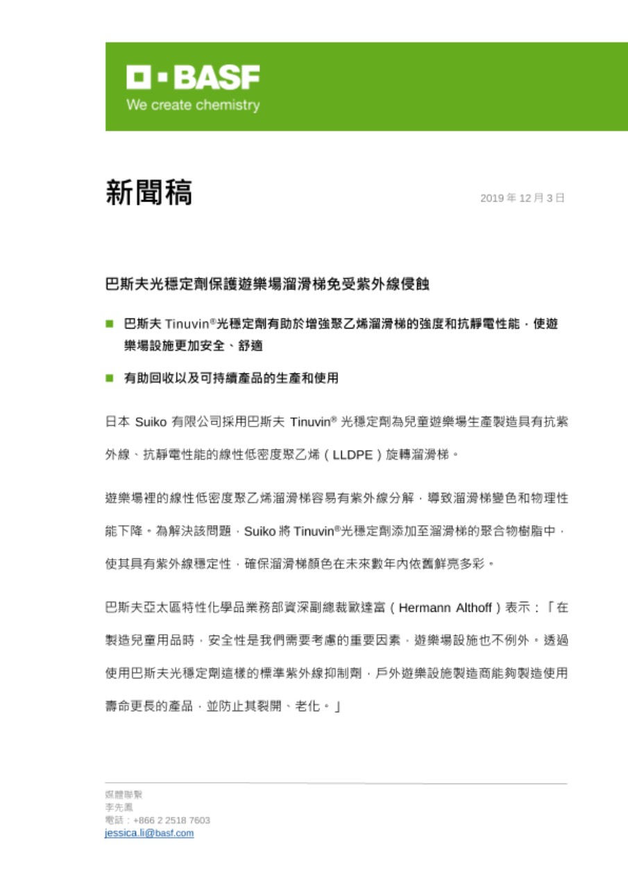Suiko研發主管Hiroyuki Sakaki表示:「溜滑梯通常設置在室外,因此需要有一定的耐候性。我們面臨的一大挑戰是如何在惡劣的天氣條件下,不僅要保持聚乙烯的物理性能,還要保持其抗靜電性能。巴斯夫憑藉其豐富詳實的紫外線吸收劑、光穩定劑和耐候性試驗資料,為我們提供了準確的產品選擇和用量建議,使我們順利開發出抗靜電溜滑梯。」