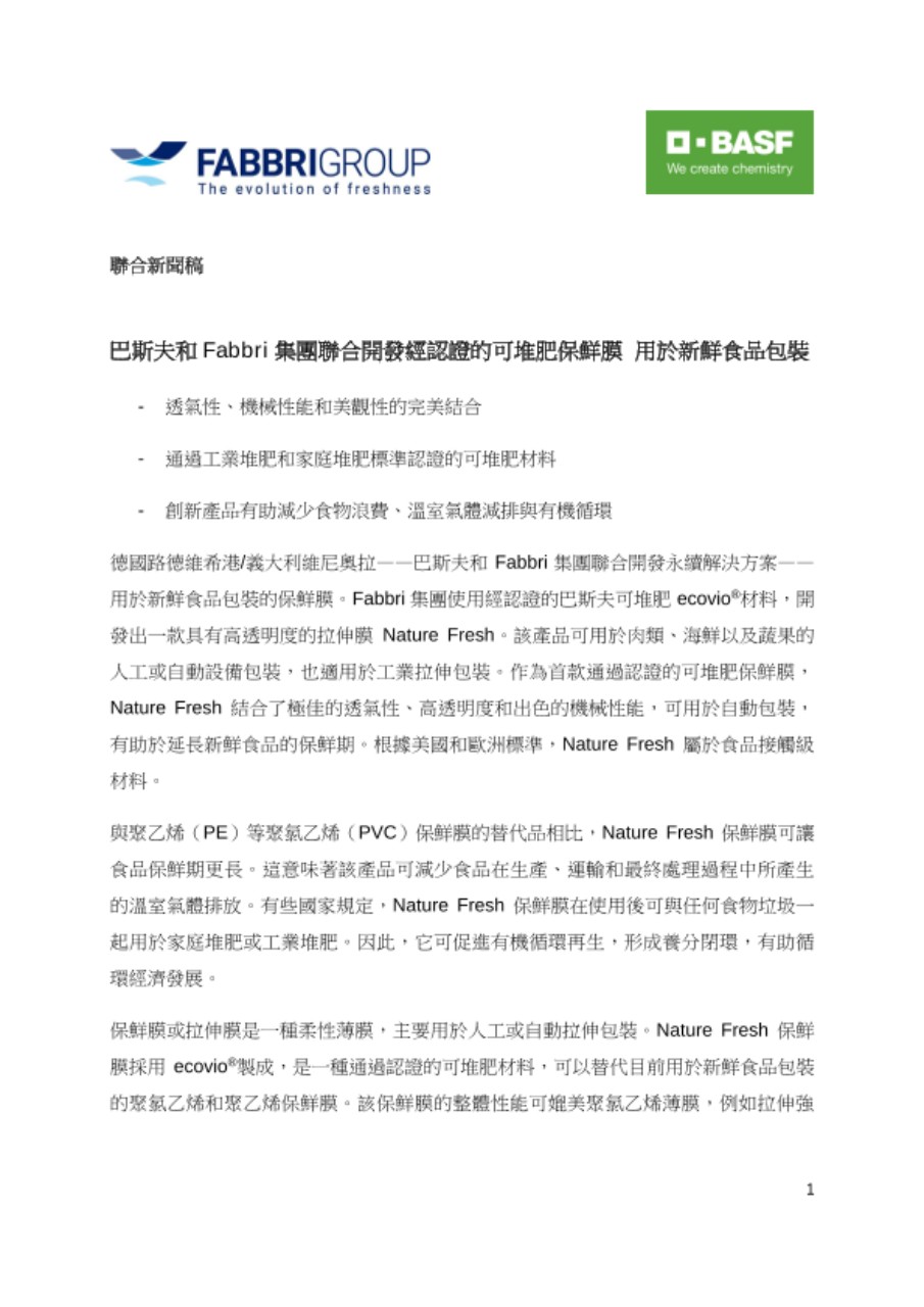 德國路德維希港/義大利維尼奧拉——巴斯夫和Fabbri集團聯合開發永續解決方案——用於新鮮食品包裝的保鮮膜。Fabbri集團使用經認證的巴斯夫可堆肥ecovio®材料,開發出一款具有高透明度的拉伸膜Nature Fresh。該產品可用於肉類、海鮮以及蔬果的人工或自動設備包裝,也適用於工業拉伸包裝。作為首款通過認證的可堆肥保鮮膜,Nature Fresh結合了極佳的透氣性、高透明度和出色的機械性能,可用於自動包裝,有助於延長新鮮食品的保鮮期。根據美國和歐洲標準,Nature Fresh屬於食品接觸級材料。