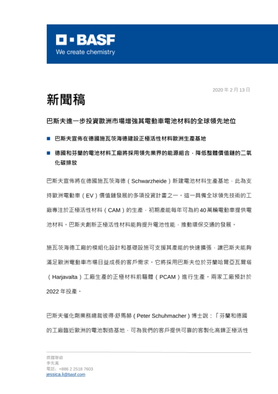 巴斯夫催化劑業務總裁彼得·舒馬赫 ( Peter Schuhmacher ) 博士說:「芬蘭和德國的工廠臨近歐洲的電池製造基地,可為我們的客戶提供可靠的客製化高鎳正極活性材料產品。」透過在芬蘭和德國的投資,巴斯夫將成為第一家在現今三個主要市場——亞洲、美國和歐洲,均有當地生產能力的正極活性材料供應商。巴斯夫也將成為可靠、永續和歐洲區供應鏈的領先供應商,它將金屬(尤其是鎳和鈷)供應、前驅體生產和正極材料生產都在歐洲進行。
