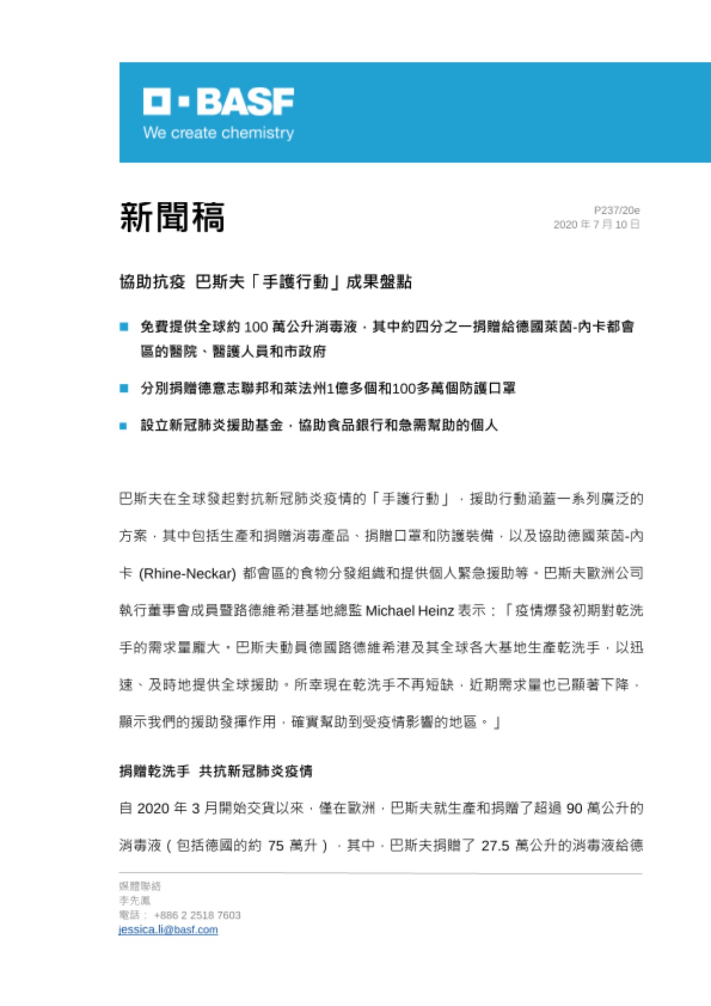 巴斯夫在全球發起對抗新冠肺炎疫情的「手護行動」,援助行動涵蓋一系列廣泛的方案,其中包括生產和捐贈消毒產品、捐贈口罩和防護裝備,以及協助德國萊茵-內卡 (Rhine-Neckar) 都會區的食物分發組織和提供個人緊急援助等。巴斯夫歐洲公司執行董事會成員暨路德維希港基地總監 Michael Heinz 表示:「疫情爆發初期對乾洗手的需求量龐大。巴斯夫動員德國路德維希港及其全球各大基地生產乾洗手,以迅速、及時地提供全球援助。所幸現在乾洗手不再短缺,近期需求量也已顯著下降,顯示我們的援助發揮作用,確實幫助到受疫情影響的地區。」