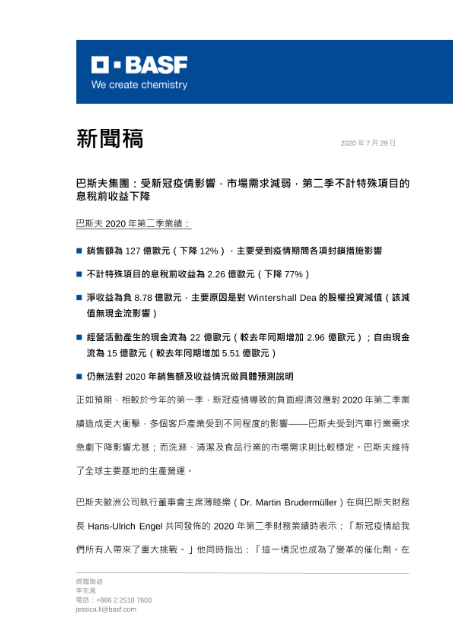 正如預期,相較於今年的第一季,新冠疫情導致的負面經濟效應對2020年第二季業績造成更大衝擊,多個客戶產業受到不同程度的影響——巴斯夫受到汽車行業需求急劇下降影響尤甚;而洗滌、清潔及食品行業的市場需求則比較穩定。巴斯夫維持了全球主要基地的生產營運。