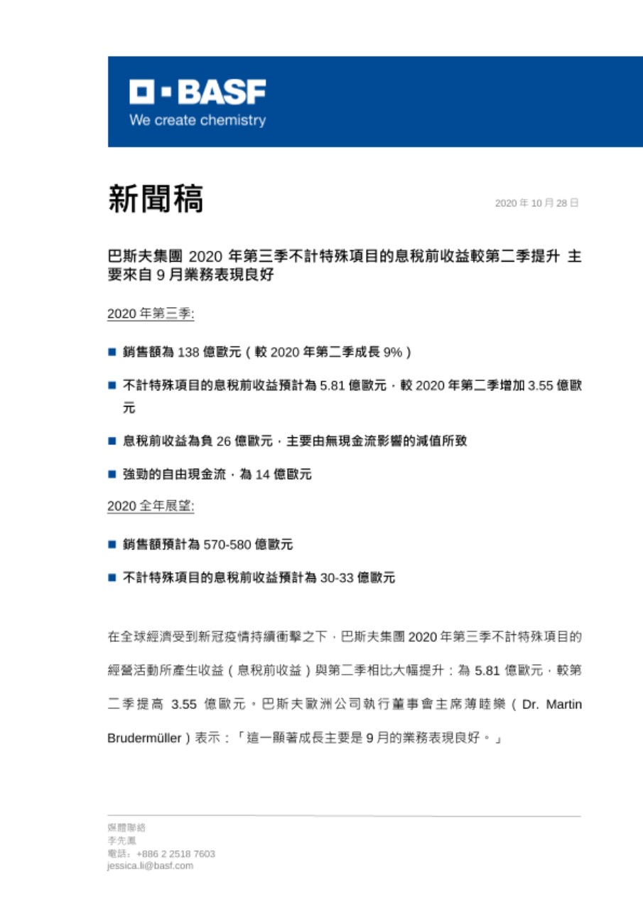 2020年10月28日,您可以透過以下連結獲取更多巴斯夫集團的資訊:
