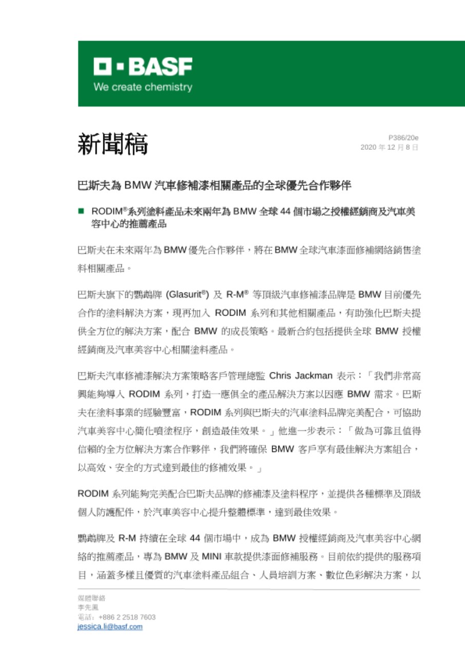 巴斯夫塗料——創新方案,超乎想像。如欲瞭解更多巴斯夫塗料業務部及其產品資訊,請上網: www.basf-coatings.com。