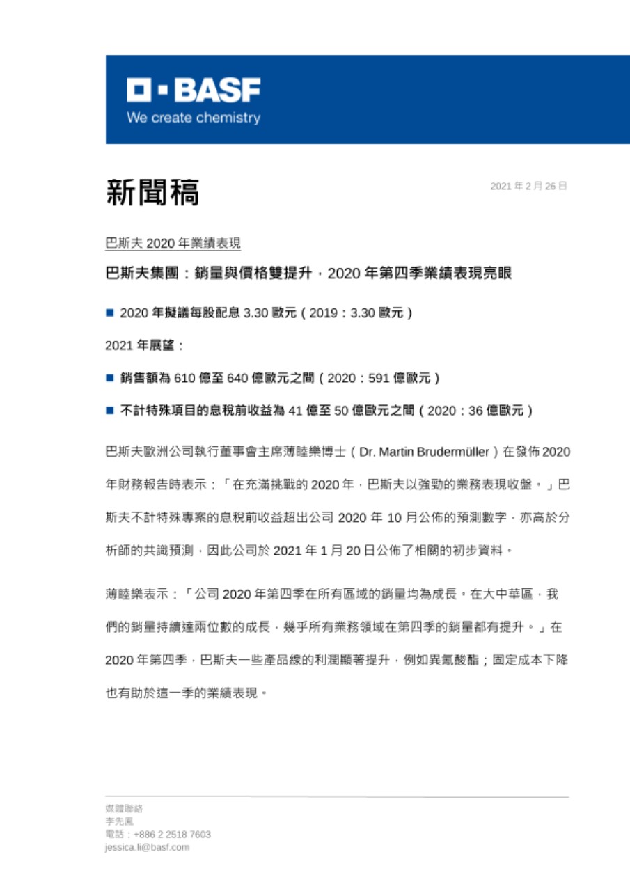 巴斯夫集團2020年度報告(台灣時間下午2:00起)