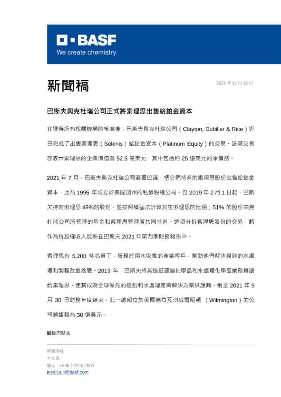 在獲得所有相關機構的核准後,巴斯夫與克杜瑞公司(Clayton, Dubilier & Rice)近日完成了出售索理思(Solenis)給鉑金資本(Platinum Equity)的交易。該項交易亦表示索理思的企業價值為 52.5 億美元,其中包括約 25 億美元的淨債務。
