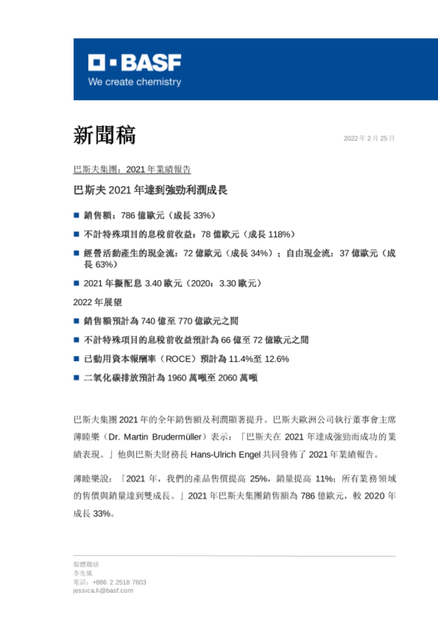 巴斯夫集團2021年的全年銷售額及利潤顯著提升。巴斯夫歐洲公司執行董事會主席薄睦樂(Dr. Martin Brudermüller)表示:「巴斯夫在2021年達成強勁而成功的業績表現。」他與巴斯夫財務長Hans-Ulrich Engel共同發佈了2021年業績報告。