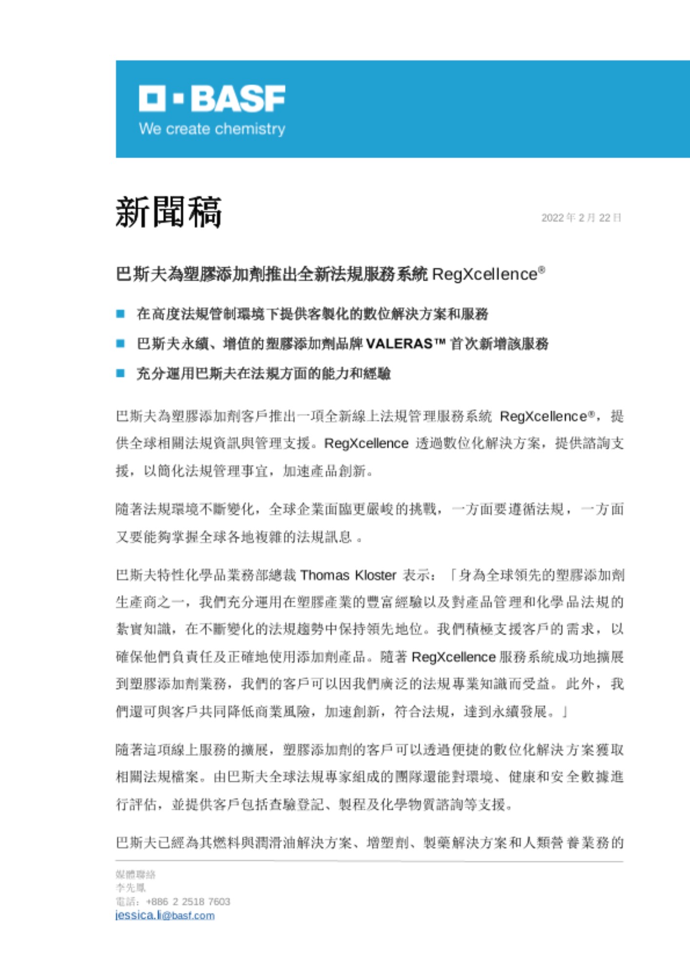 巴斯夫特性化學品業務部總裁 Thomas Kloster 表示:「身為全球領先的塑膠添加劑生產商之一,我們充分運用在塑膠產業的豐富經驗以及對產品管理和化學品法規的紮實知識,在不斷變化的法規趨勢中保持領先地位。我們積極支援客戶的需求,以確保他們負責任及正確地使用添加劑產品。隨著 RegXcellence 服務系統成功地擴展到塑膠添加劑業務,我們的客戶可以因我們廣泛的法規專業知識而受益。此外,我們還可與客戶共同降低商業風險,加速創新,符合法規,達到永續發展。」