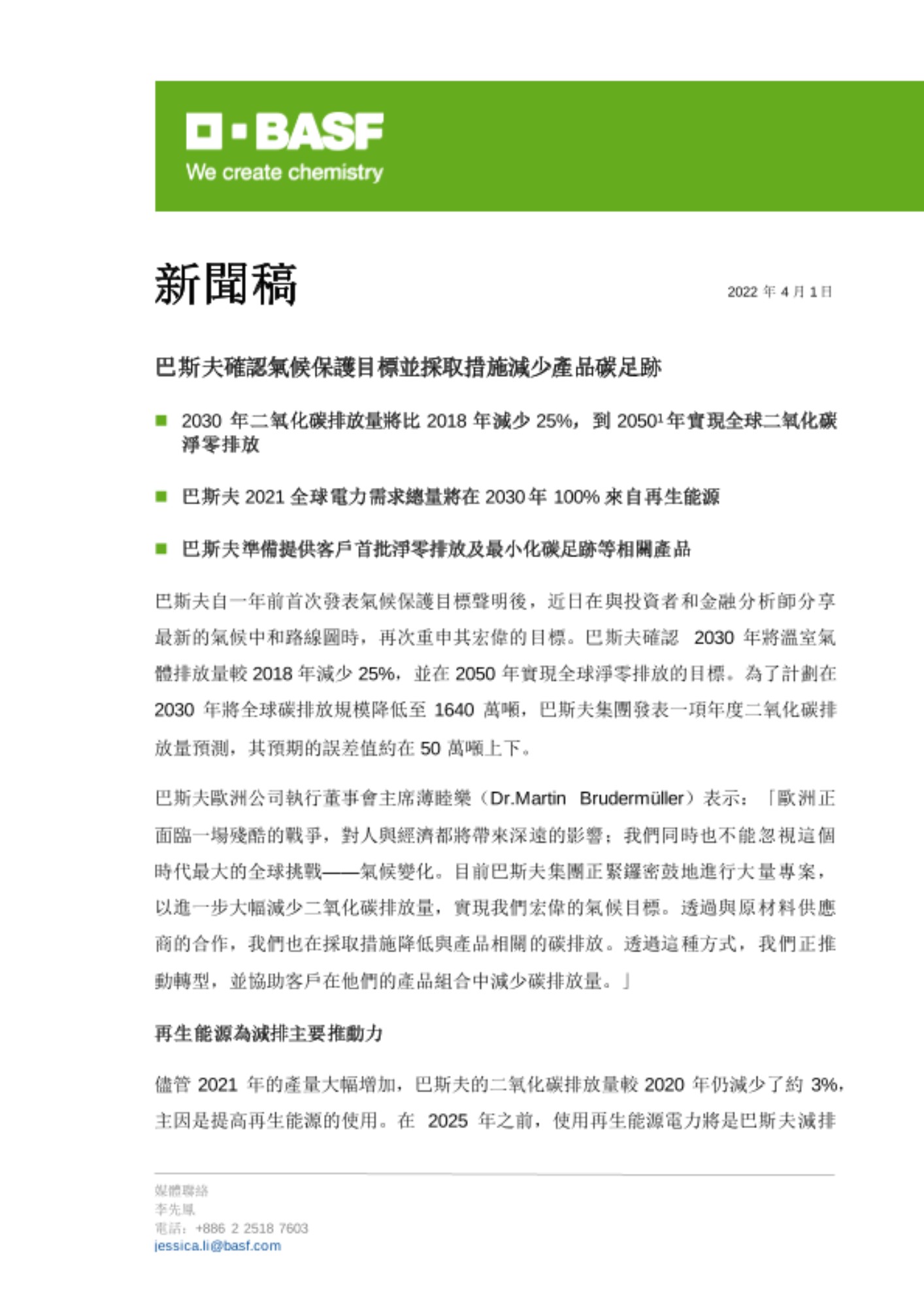 巴斯夫歐洲公司執行董事會主席薄睦樂(Dr.Martin Brudermüller)表示:「歐洲正面臨一場殘酷的戰爭,對人與經濟都將帶來深遠的影響;我們同時也不能忽視這個時代最大的全球挑戰——氣候變化。目前巴斯夫集團正緊鑼密鼓地進行大量專案,以進一步大幅減少二氧化碳排放量,實現我們宏偉的氣候目標。透過與原材料供應商的合作,我們也在採取措施降低與產品相關的碳排放。透過這種方式,我們正推動轉型,並協助客戶在他們的產品組合中減少碳排放量。」