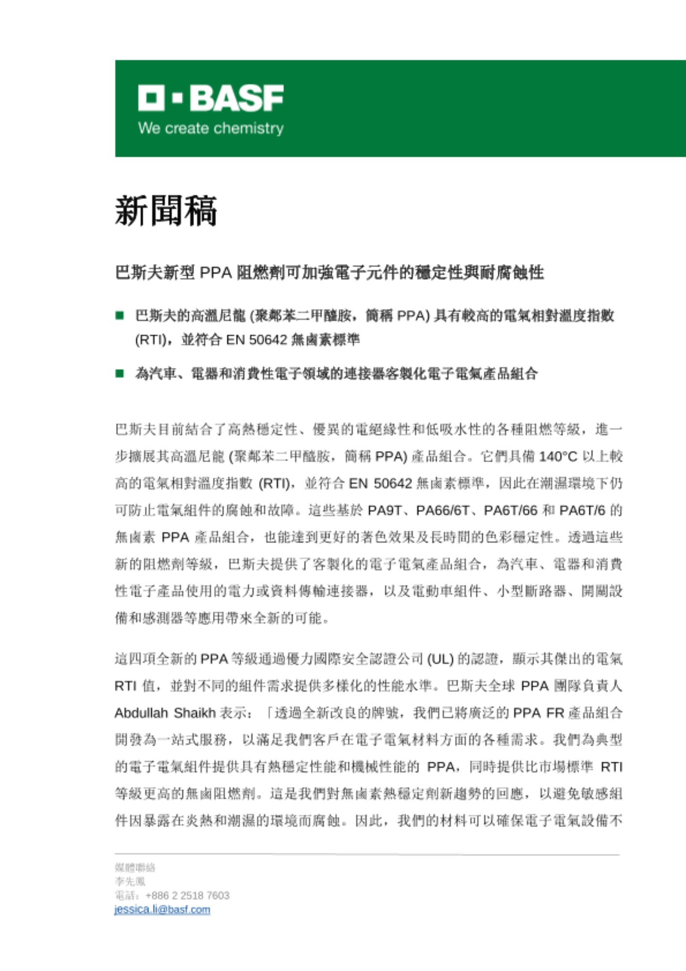 這四項全新的PPA等級通過優力國際安全認證公司 (UL) 的認證,顯示其傑出的電氣RTI值,並對不同的組件需求提供多樣化的性能水準。巴斯夫全球PPA團隊負責人Abdullah Shaikh表示:「透過全新改良的牌號,我們已將廣泛的PPA FR產品組合開發為一站式服務,以滿足我們客戶在電子電氣材料方面的各種需求。我們為典型的電子電氣組件提供具有熱穩定性能和機械性能的PPA,同時提供比市場標準RTI等級更高的無鹵阻燃劑。這是我們對無鹵素熱穩定劑新趨勢的回應,以避免敏感組件因暴露在炎熱和潮濕的環境而腐蝕。因此,我們的材料可以確保電子電氣設備不會發生故障,並能長期正常運作。」
