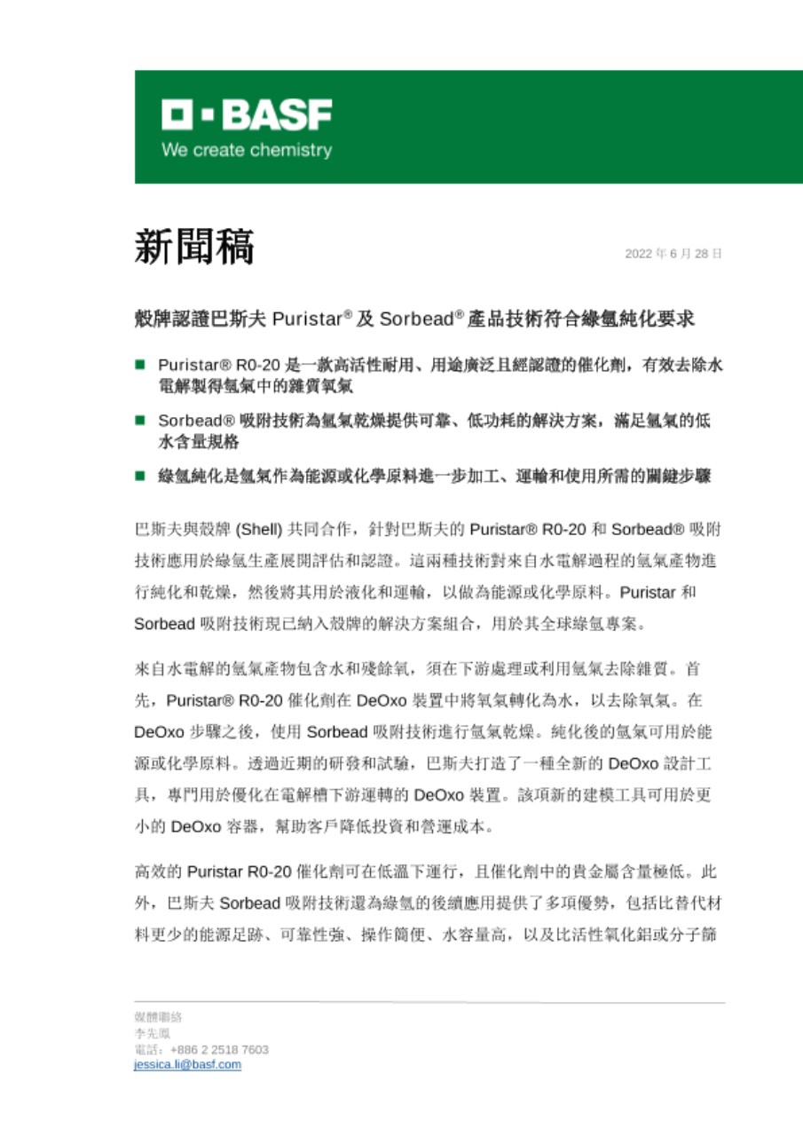巴斯夫與殼牌 (Shell) 共同合作,針對巴斯夫的 Puristar® R0-20 和 Sorbead® 吸附技術應用於綠氫生產展開評估和認證。這兩種技術對來自水電解過程的氫氣產物進行純化和乾燥,然後將其用於液化和運輸,以做為能源或化學原料。Puristar 和 Sorbead 吸附技術現已納入殼牌的解決方案組合,用於其全球綠氫專案。