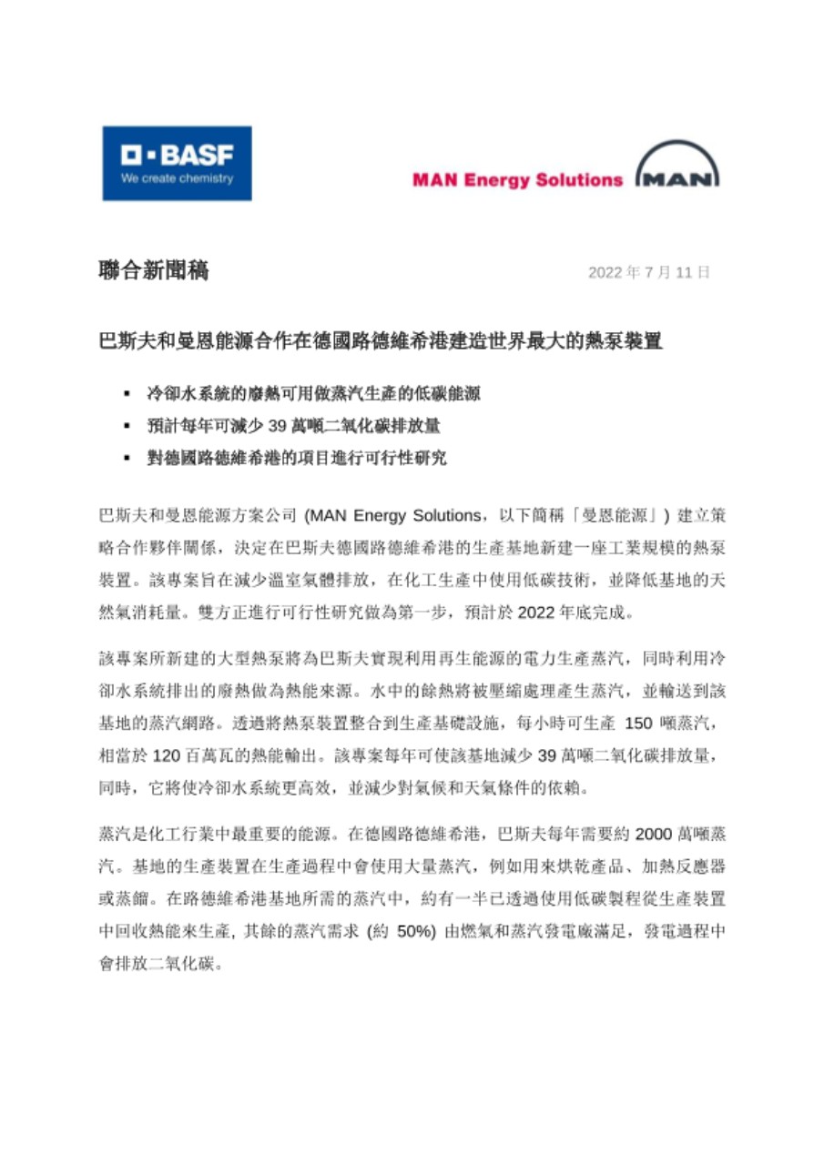 巴斯夫和曼恩能源方案公司 (MAN Energy Solutions,以下簡稱「曼恩能源」) 建立策略合作夥伴關係,決定在巴斯夫德國路德維希港的生產基地新建一座工業規模的熱泵裝置。該專案旨在減少溫室氣體排放,在化工生產中使用低碳技術,並降低基地的天然氣消耗量。雙方正進行可行性研究做為第一步,預計於2022年底完成。