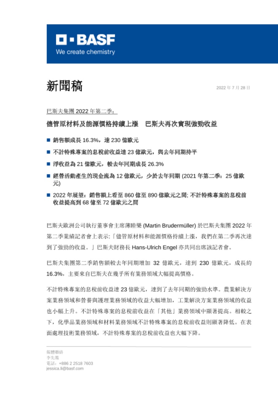 | 巴斯夫集團2022上半年度報告 (台灣時間下午1:00起) | |