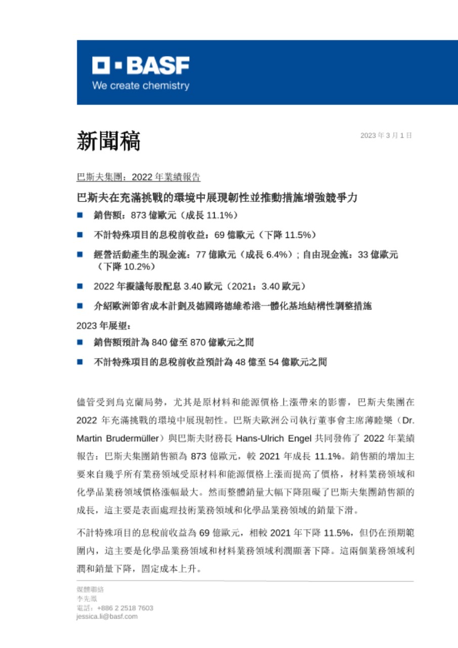 儘管受到烏克蘭局勢,尤其是原材料和能源價格上漲帶來的影響,巴斯夫集團在2022年充滿挑戰的環境中展現韌性。巴斯夫歐洲公司執行董事會主席薄睦樂(Dr. Martin Brudermüller)與巴斯夫財務長Hans-Ulrich Engel共同發佈了2022年業績報告:巴斯夫集團銷售額為873億歐元,較2021年成長11.1%。銷售額的增加主要來自幾乎所有業務領域受原材料和能源價格上漲而提高了價格,材料業務領域和化學品業務領域價格漲幅最大。然而整體銷量大幅下降阻礙了巴斯夫集團銷售額的成長,這主要是表面處理技術業務領域和化學品業務領域的銷量下滑。
