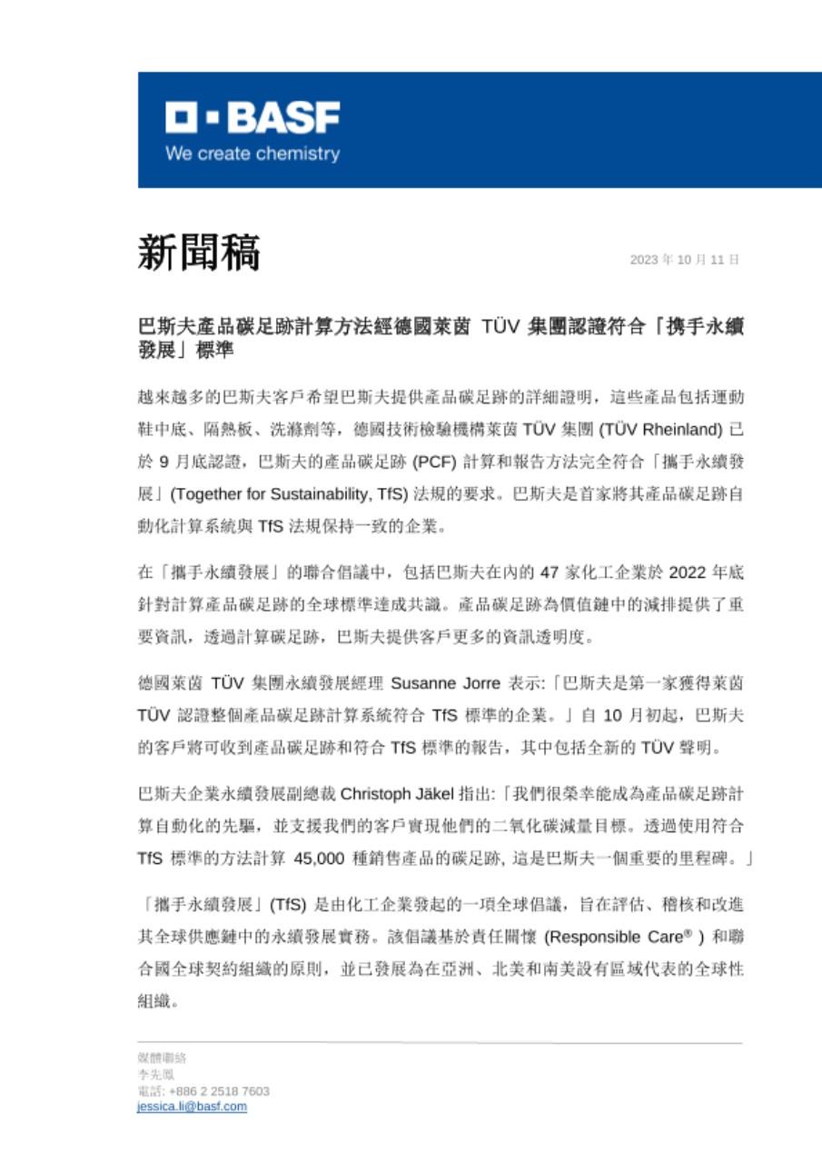 越來越多的巴斯夫客戶希望巴斯夫提供產品碳足跡的詳細證明,這些產品包括運動鞋中底、隔熱板、洗滌劑等,德國技術檢驗機構萊茵 TÜV 集團 (TÜV Rheinland) 已於 9 月底認證,巴斯夫的產品碳足跡 (PCF) 計算和報告方法完全符合「攜手永續發展」(Together for Sustainability, TfS) 法規的要求。巴斯夫是首家將其產品碳足跡自動化計算系統與 TfS 法規保持一致的企業。