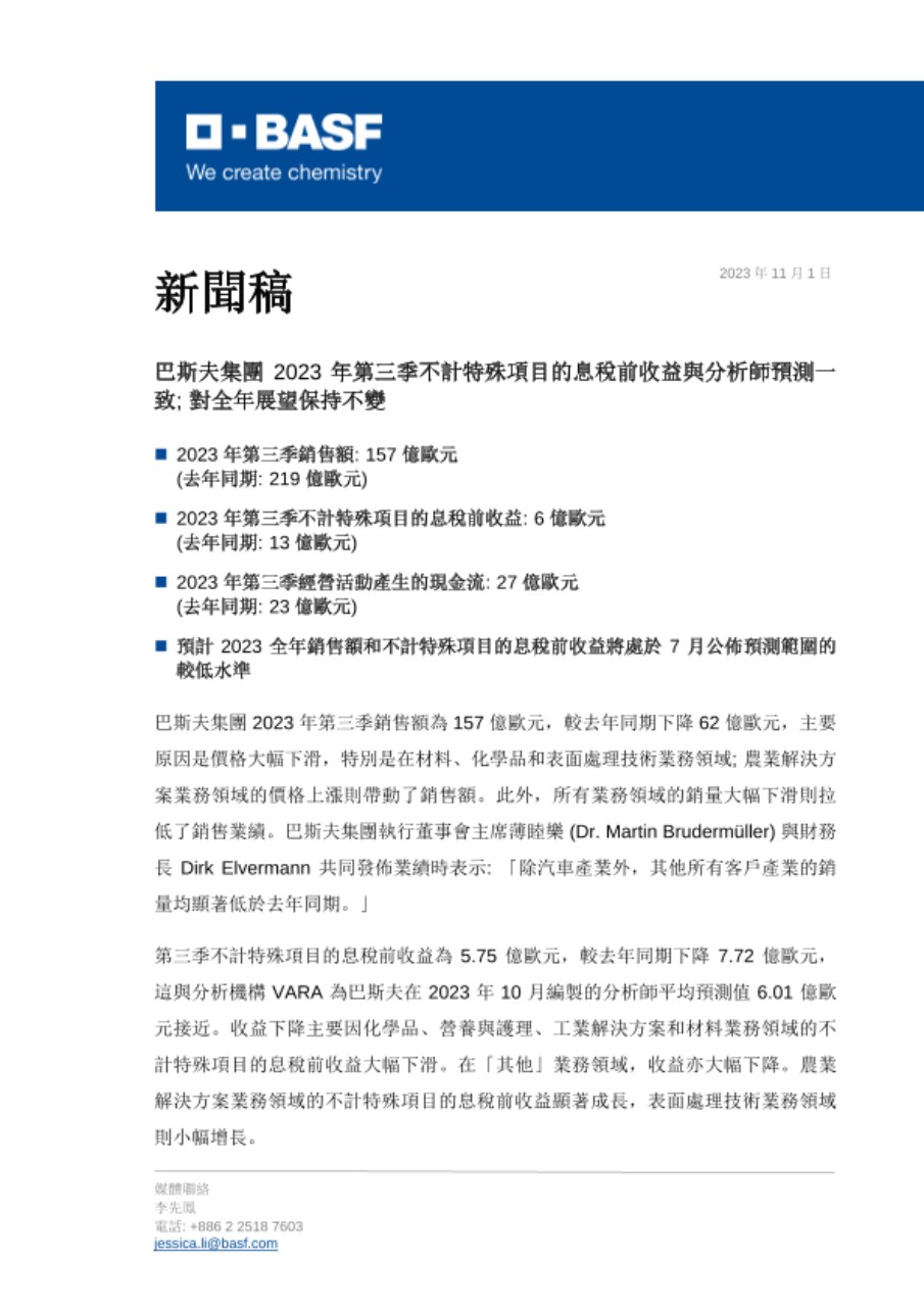 巴斯夫集團 2023 年第三季銷售額為 157 億歐元,較去年同期下降 62 億歐元,主要原因是價格大幅下滑,特別是在材料、化學品和表面處理技術業務領域; 農業解決方案業務領域的價格上漲則帶動了銷售額。此外,所有業務領域的銷量大幅下滑則拉低了銷售業績。巴斯夫集團執行董事會主席薄睦樂 (Dr. Martin Brudermüller) 與財務長 Dirk Elvermann 共同發佈業績時表示: 「除汽車產業外,其他所有客戶產業的銷量均顯著低於去年同期。」