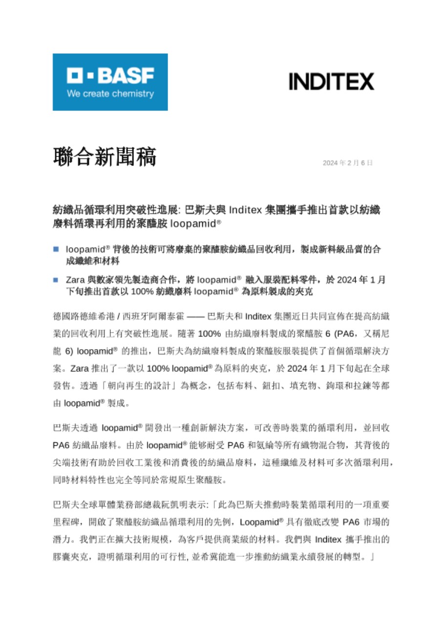 巴斯夫全球單體業務部總裁阮凱明表示:「此為巴斯夫推動時裝業循環利用的一項重要里程碑,開啟了聚醯胺紡織品循環利用的先例,Loopamid® 具有徹底改變 PA6 市場的潛力。我們正在擴大技術規模,為客戶提供商業級的材料。我們與 Inditex 攜手推出的膠囊夾克,證明循環利用的可行性, 並希冀能進一步推動紡織業永續發展的轉型。」